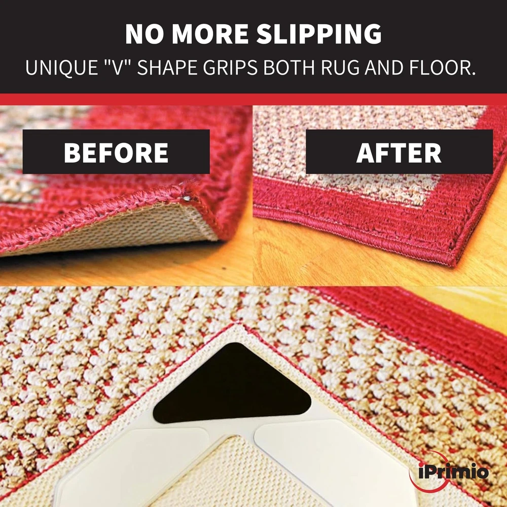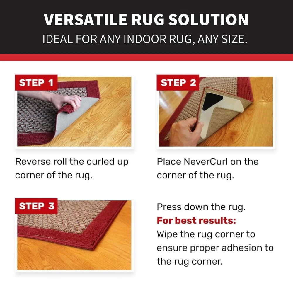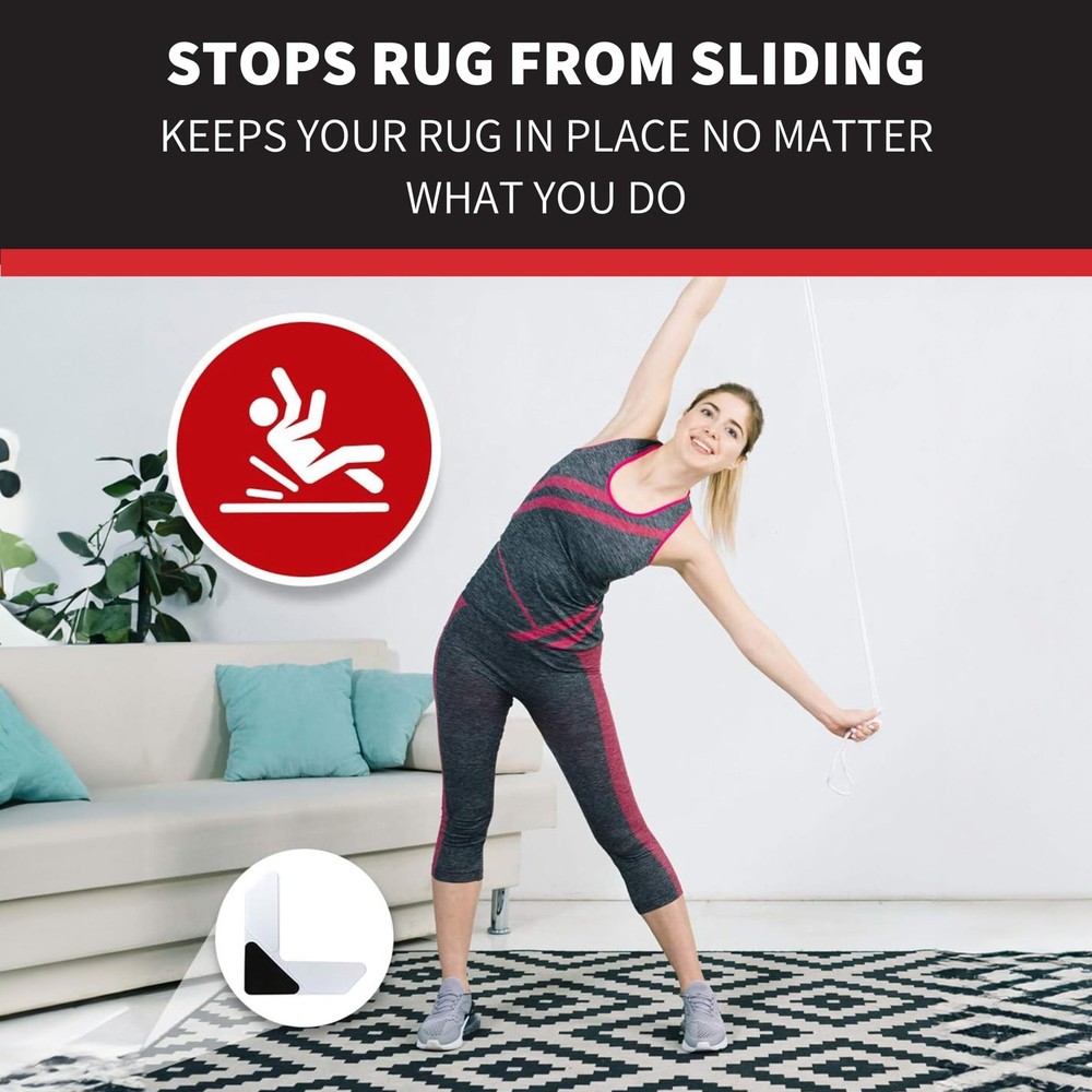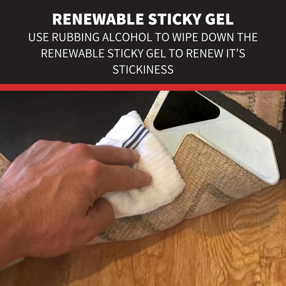 StepNGrip Rug Corner Grippers 4-Pack - Flattens Edges to Hold 4-Pack, White Product Details Instant Rug Stability: StepNGrip rug grippers instantly flatten rug corners to hold rug down; effectively prevents curling and slipping for a neat appearance and added safety in any space Adhesive for Strong Hold: Features a renewable sticky gel that provides a firm grip on rug corners; corner carpet grippers allow easy repositioning without leaving residue, perfect for hardwood floors Effortless Cleaning Access: Easy lift design enables quick lifting of rug corners for cleaning underneath; eliminates the hassle of removing entire rugs, keeping maintenance simple and convenient Durable and Reusable: Made to last with a stiff layer that maintains grip and shape; rug corner grippers for hardwood floors is an ideal solution for impeding curling and keeping rugs firmly in place Weatherproof and Versatile: Suitable for all weather conditions, the never curl rug tape grippers are perfect for both indoor and outdoor use; dimensions 7.5 x 7.5 inches for each piece.