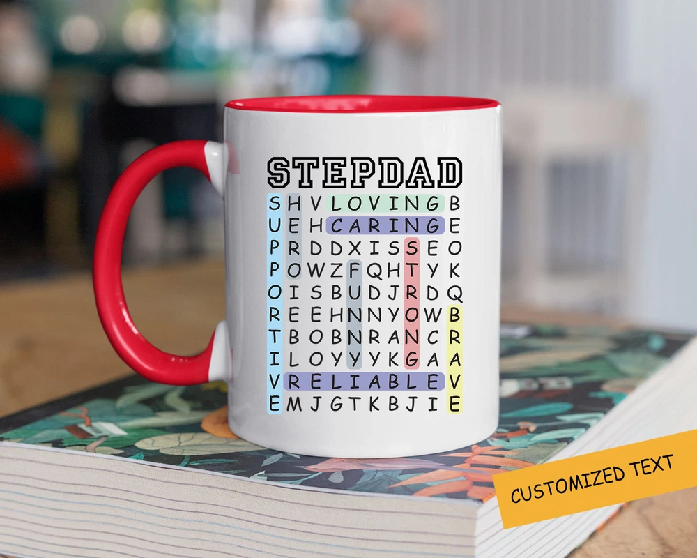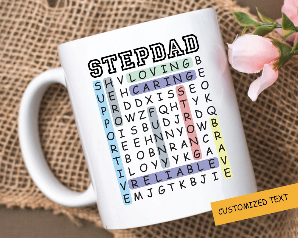 Stepdad Word Search Puzzles Personalized Mug Fathers Day Gift Mug For Bonus Dad Product Details.. This high quality 11oz. ceramic white mug has a premium hard coat that provides crisp and vibrant color reproduction sure to last for years. Perfect for all hot & cold beverages. The highest quality printing possible is used. It will never fade no matter how many times you wash it. Material: 100% Ceramic. Print both sides. Dishwasher and Microwave Safe. High Gloss + Premium White Finish. Printed in the U.S.A. Personalized & Custom. We support personalized and custom mug to add custom, when placing an order, you can add notes to the "order note" in shipping address section. Also you can contact us directly via message. Shipping Info. Ready to ship in 1 to 2 business days, All products are made-to-order and proudly printed in the United States. Shipped by USPS and DHL, You will receive your order in 5-7 days. Replace & Refund. All products are defective during shipping broken, chipped will be replaced free of charge. You are not satisfied with the product, we will refund 100% money to you. If any other issues arise, please do not hesitate to message, we would be more than happy to assist you.