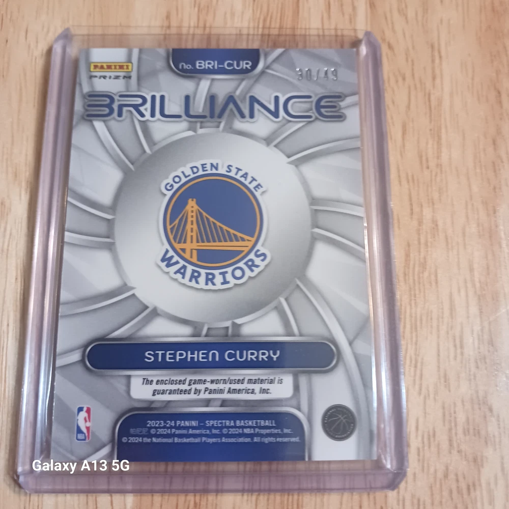 The product is a 2023-24 Panini Spectra trading card featuring basketball player Stephen Curry from the Golden State Warriors. This card is a special "Brilliance" edition with a game-worn patch that matches the jersey number worn by Curry. It is a limited edition card, serial numbered 30/75 matching his Golden State Warriors Number, making it a rare collectible for fans and collectors of sports trading cards. The card is an original manufactured by Panini for the National Basketball Association (NBA) season. On Dec-22-24 at 19:59:04 PST, seller added the following information: This card is 30/49 as pictured
