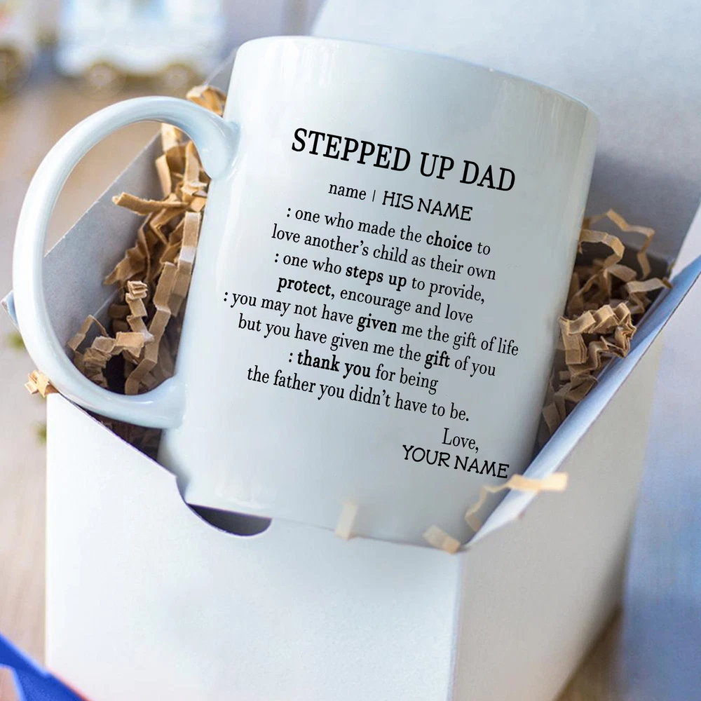 Stepped Up Dad Mug Fathers Day Mug Bonus Dad Step Dad Gift Gift For Him Fathers Product Details.. This high quality 11oz. ceramic white mug has a premium hard coat that provides crisp and vibrant color reproduction sure to last for years. Perfect for all hot & cold beverages. The highest quality printing possible is used. It will never fade no matter how many times you wash it. Material: 100% Ceramic. Print both sides. Dishwasher and Microwave Safe. High Gloss + Premium White Finish. Printed in the U.S.A. Personalized & Custom. We support personalized and custom mug to add custom, when placing an order, you can add notes to the "order note" in shipping address section. Also you can contact us directly via message. Shipping Info. Ready to ship in 1 to 2 business days, All products are made-to-order and proudly printed in the United States. Shipped by USPS and DHL, You will receive your order in 5-7 days. Replace & Refund. All products are defective during shipping broken, chipped will be replaced free of charge. You are not satisfied with the product, we will refund 100% money to you. If any other issues arise, please do not hesitate to message, we would be more than happy to assist you.