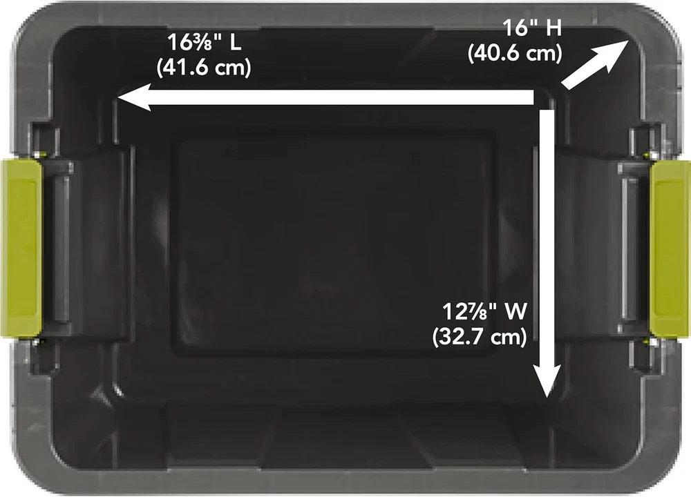 Sterilite 18 Gal Latching Tuff1 Storage Tote, Stackable Bin with Dark Indigo Product Details Brand: Sterilite Color: Dark Indigo Material: Plastic Special Feature: Stackable, Durability Resistant, Impact Resistant, Lockable Style: Latch Tuff1 Recommended Uses For Product: Outdoor Storage Product Dimensions: 23"L x 16.63"W x 17.25"H Capacity: 18 Gallons Closure Type: Latch Water Resistance Level: Waterproof Item Weight: 5.8 Pounds Opening Mechanism: Latch Shape: Rectangular Pattern: Solid Number of Items: 6 Storage Volume: 68.14 Liters Number of Compartments: 1 Unit Count: 6.0 Count Item Package Quantity: 1 Occasion: Halloween Maximum Weight Recommendation: 75 Pounds Item Weight: 5.8 pounds Manufacturer: Sterilite Corporation Item model number: 1525 Is Discontinued By Manufacturer: No Volume: 18 Gallons Assembly required: No Number of pieces: 6 Batteries required: No Dimensions: 23" L x 17 1/4" W x 16 5/8" H Made in the USA Interior Dimensions at bottom: 16 3/8" x 12 7/8" x 16" Temperature and impact resistant, ideal for use in garage, attic or basement areas Latching Tuff1 Totes are a great storage solution for camping supplies, sporting equipment and seasonal items Take advantage of that storage space in basements, garages, or attics with Sterilite's rugged line of Tuff1 Totes. Tuff1 Totes feature durability and strength for added peace of mind that contents will stay safely stored inside. The Sterilite 18 Gallon Latching Tuff1 Totes make a great solution for storing away camping supplies, sporting equipment, and seasonal items in more challenging environments. Made from polyethylene, these totes are rugged and impact resistant even in colder temperatures, making them ideal for more active storage needs. Contoured end panels and robust latches make for a sure and comfortable grip when carrying. The latches also offer extra security that the lid will stay attached to the base, and contents in place. Deep recessed lids allow multiple totes to stack securely for efficient use of vertical space, while the channeled walls and thick reinforced rim provide added strength and rigidity. The overall assembled dimensions of this item are 23" L x 17 1/4" W x 16 5/8" H.