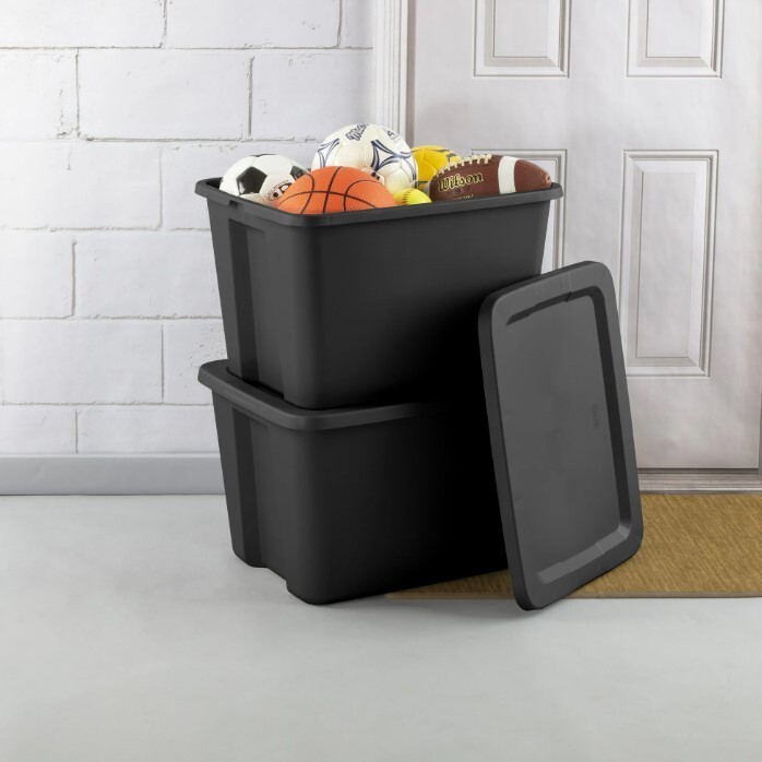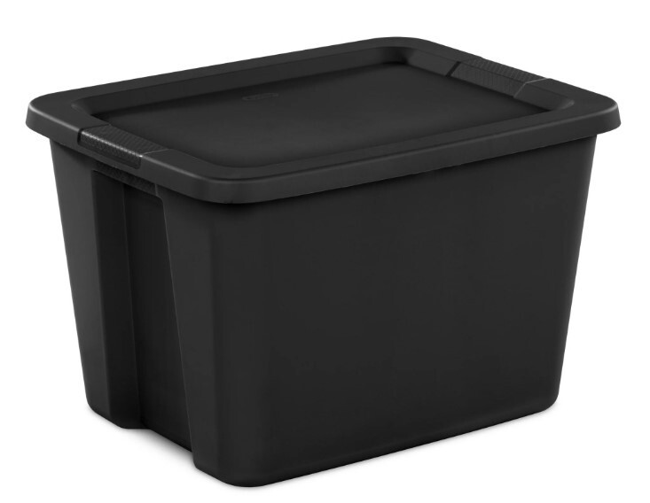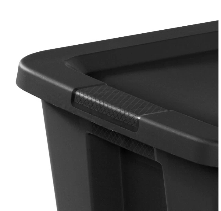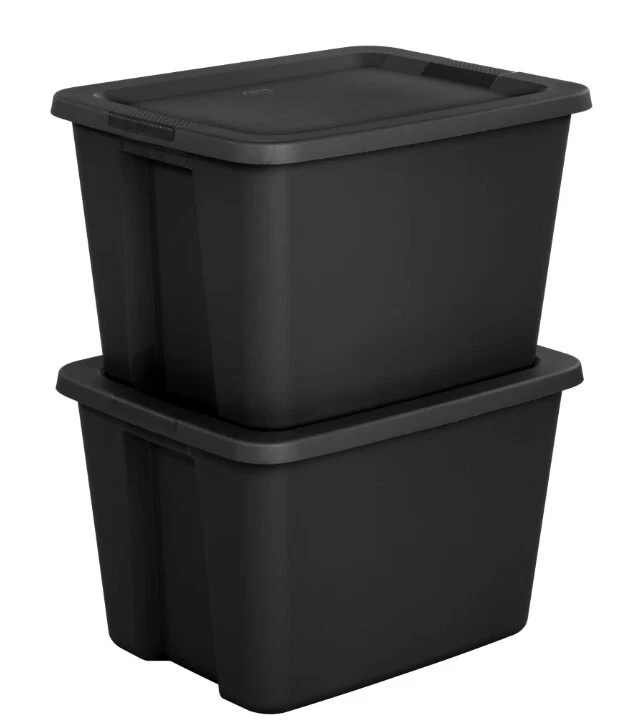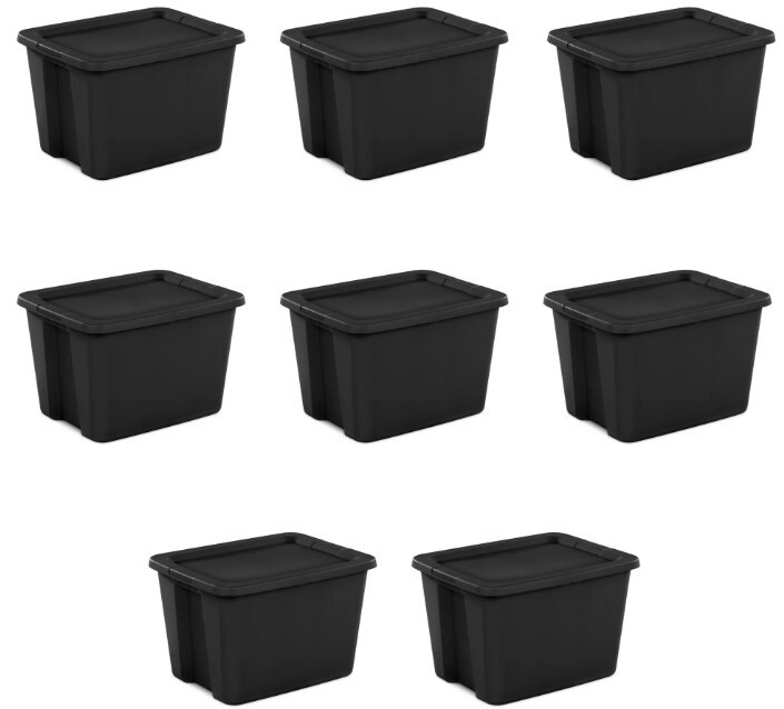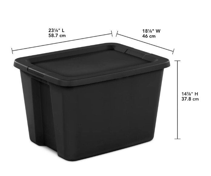 18 Gallon Tote Box Plastic Adult, Black, Clothing Storage, 18 gal, Set of 8. Product details Organize, contain and store it away in Sterilite's 18 Gallon Tote. This popular size tote is ideal for a variety of basic and lightweight household needs, such as sorting and storing clothing, toys, linens, craft supplies, seasonal decorations and more! The simple squared off design offers a space efficient shape, and a broad rim for added strength. The lid securely snaps to the base, keeping contents safely in place and concealed. The contoured end panels and textured in molded handles provide a comfortable grip for lifting and carrying, making transporting the tote easier, whether moving into a dorm or storing away belongings in the attic or basement. The deep recessed surface of the lid allows totes to stack neatly on top of each other for efficient use of vertical storage space. When storing items away, use good judgment and don’t overload them or stack them too high; be mindful of the weight in each tote and place the heaviest tote on the bottom. The overall assembled dimensions of this item are 23 1/8" L x 18 1/8" W x 14 7/8" H. Sterilite Adult Plastic 18 Gal. Tote Box Black Outside Dimensions: 23 1/8" x 18 1/8" x 14 7/8" Interior Dimensions at bottom: 16 3/4" x 13 3/4" x 14 3/8" This popular size tote is ideal for a variety of lightweight household storage needs, such as clothing, toys, and linens Integrated handles with textured surface provides a sure grip for more comfortable carrying Lid snaps firmly to base to ensure contents stay contained and concealed Deep recessed lid allows for secure stacking to maximize vertical storage space BPA-free and phthalate-free