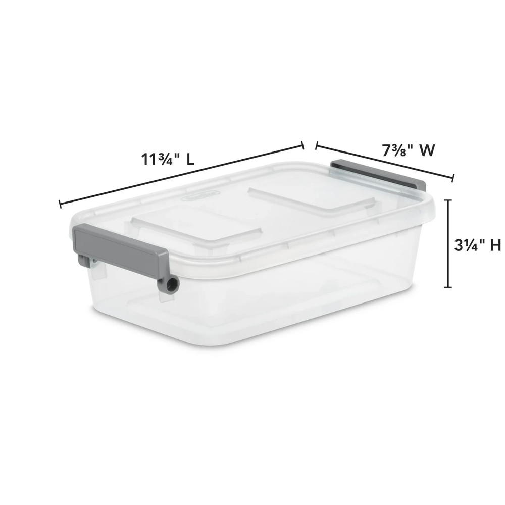 Sterilite 2.7 Qt Modular Latch Box – Titanium Product Details • Compact Dimensions: Outside size 11 3/4" L x 7 3/8" W x 3 1/4" H; interior bottom size 9 1/2" x 6" x 2 5/8". • Clear Visibility: Clear base and lid make it easy to see contents from any angle. • Customizable Labeling: Write-on ID latches allow simple labeling with dry-erase markers or adhesive labels. • Versatile Storage: Great for organizing health and beauty items, accessories, craft supplies, office essentials, and more. • Efficient Stacking: Stacks neatly with other Sterilite Modular Latch Boxes, including the 5.5 Qt, for vertical space savings. • Safe Materials: Made from BPA-free and phthalate-free plastic. Overview The Sterilite 2.7 Qt Modular Latch Box provides a practical way to organize small items in closets, bathrooms, craft rooms, workspaces, and play areas. Its clear construction helps you quickly identify what’s inside, while the color-accented write-on latches keep the lid secure and offer space for easy personalization. The shared lid footprint with the 5.5 Qt size allows shallow and deep boxes to stack together for a streamlined storage system. Specifications • Storage Type: Storage Box • Brand: Sterilite • Material: Plastic • Color: Gray (Titanium Accent) We follow all eBay policies.