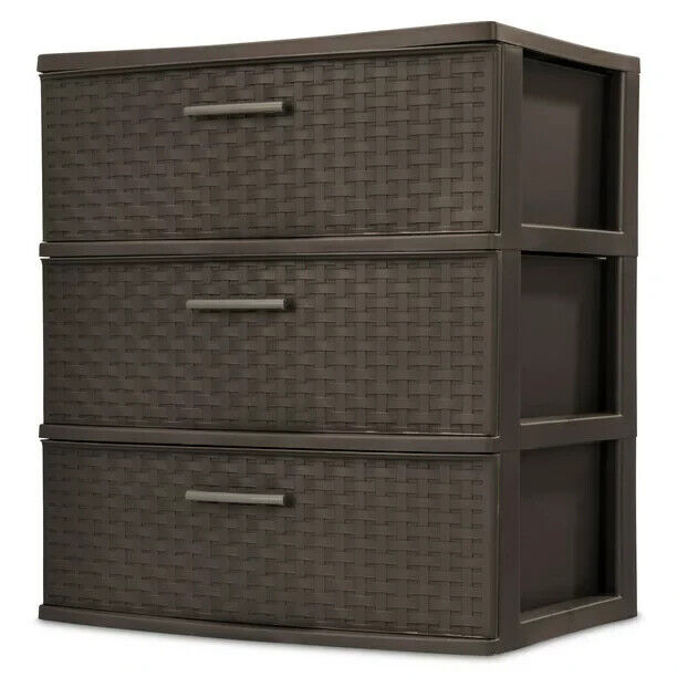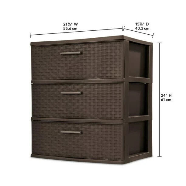 3-Drawer Wide Weave Design Storage Tower, Brown, Case of 1 "A stylish and functional solution to overflowing closets or clutter, the Sterilite 3-Drawer Wide Weave Design Storage Tower is a must-have for home storage. This 3-drawer storage chest is ideal for storing clothing or doing a bit of good old-fashioned organizing. It features three spacious drawers with convenient pull handles as well as a durable, long-lasting plastic construction. Not your average storage solution, this fresh take on organization is designed to look like a dresser with its intricate weave design. The dark brown color also adds to this piece's furniture-like look, making it even more convenient for you to blend it in with your existing decor. Ideal for keeping frequently used, lightweight items contained and organized you can easily maintain cluttered areas. This versatile storage drawer tower will look fantastic in your bedroom, dorm room, kitchen, or game room. If you need help getting organized and want to do it in style, pick up the Sterilite 3-Drawer Wide Weave Design Storage Tower." "• Multi-purpose 3-drawer storage tower with pull handles that provides a chic storage solution • Stylish weave pattern provides a furniture-like look created from easy-to-clean, durable plastic • Versatile decorative storage solution ideal for use throughout your home, dorm room, and more • Opaque drawers keep contents concealed and clutter controlled and provide ideal organization • Keep frequently used items contained and organized where they are most often used • Material: Plastic • Color: Brown • Interior dimensions at bottom of drawer (L x W x H): 19.12 x 13.25 x 6.62 inches • Overall dimensions: (L x W x H) 15.86 x 21.86 x 24 inches • Weight: 12 pounds" Assembled Product Weight 9.47 lb Number of Drawers 3 Recommended Location Indoor Capacity 32 Quarts per Drawer Count 1 Material Plastic Finish Espresso Model 2530-6P Features Organize visible storage areas with Sterilite’s Weave collection. Assembled Product Dimensions (L x W x H) 15.88 x 21.88 x 24.00 Inches On Nov 8, 2024 at 06:23:24 PST, seller added the following information: