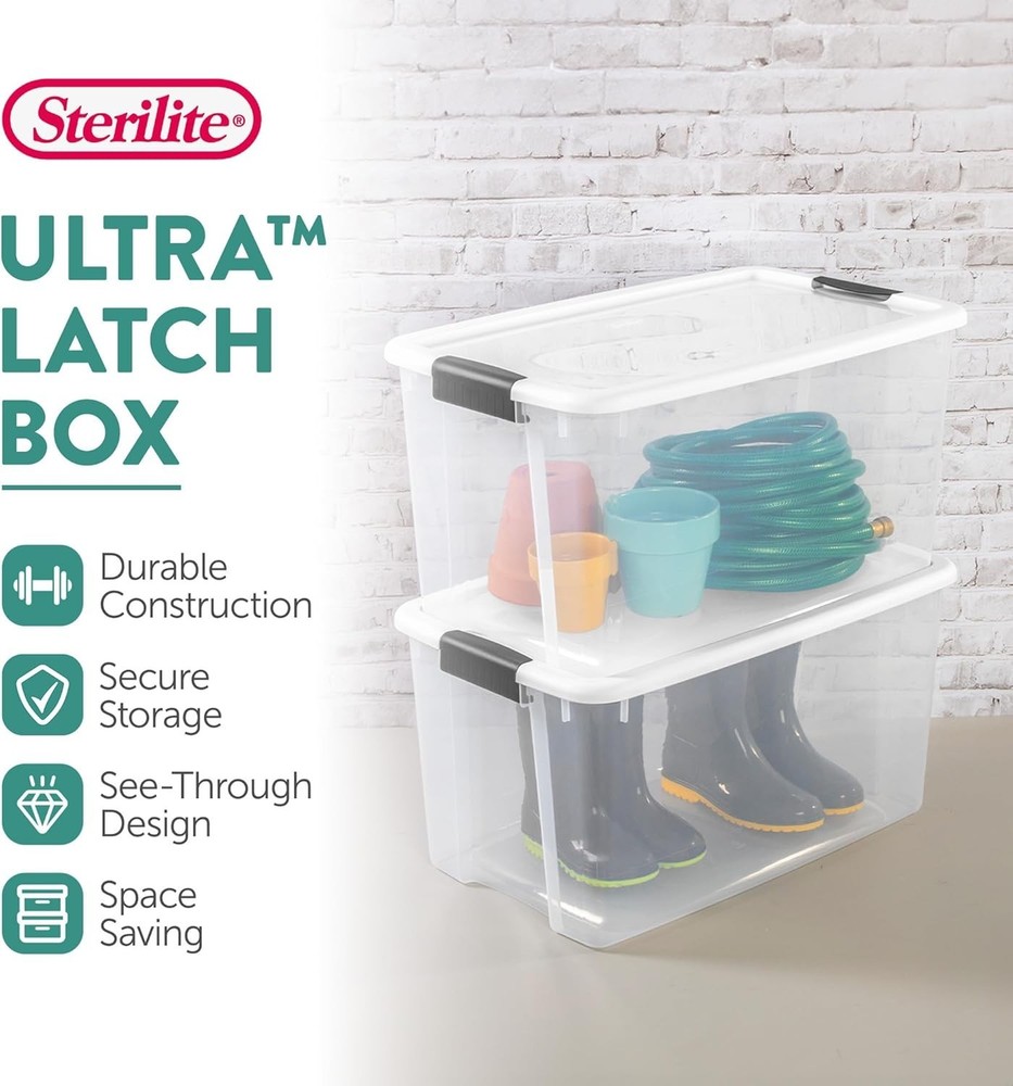 Nullify Dimensions & Size: The storage boxes have outside dimensions of 26 1/8" x 16 1/4" x 13 1/2" and interior dimensions at the bottom of 20" x 13 1/2" x 12 5/8", making them ideal for storage needs. Durability & Security: Sterilite's Ultra Latch Boxes provide a durable storage solution. Equipped with heavy-duty latches, the lid attaches securely to the base, keeping contents protected. Transparent & Convenient: The clear base design allows for effortless viewing of stored items, helping you quickly identify and access what you need. Organize Effortlessly: A stackable design makes efficient use of vertical space in closets, basements, garages, and attics, ensuring areas remain tidy and items are easily accessible. Sterilite products are proudly made in the USA since 1939 and are BPA and phthalate-free.
