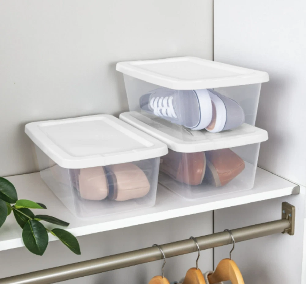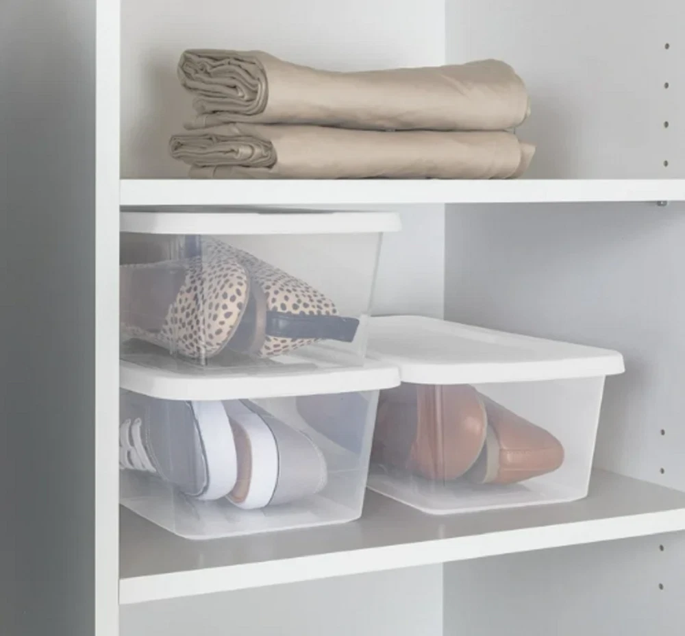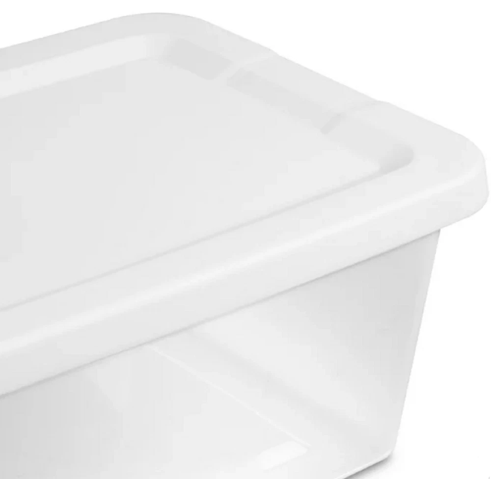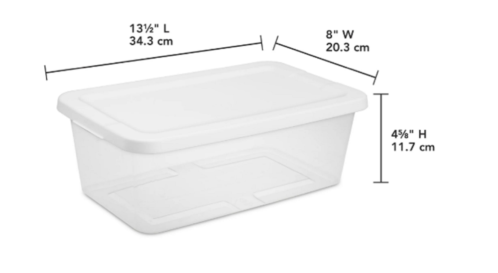 Sterilite Set of (10) Small Storage Bin, 6 Quart Clear Plastic Storage Container with Snap-On Lid, White Description : Organization is made easy with Sterilite's Set of (10) 6 Quart Storage Boxes! The convenient pack includes ten of the popular 6 Quart size storage bins with lids. The clear base lets you see what's inside while the snap on-lid keeps everything contained. The space-efficient shape and deep recessed lids allow bins to stack securely, maximizing vertical storage space. Sort and store a variety of household items to bring order to closets and bedrooms! This size plastic storage container is ideal for storing shoes, accessories, crafts and more, and conveniently fits on standard closet shelving. Note: Use good judgment when storing items, don’t overload, keep heaviest bin at bottom, and don’t stack too high. The overall assembled dimensions of this item are 13 1/2" L x 8" W x 4 5/8" H. Sterilite Set of (10) 6 Quart Storage Boxes, Clear Plastic Storage Bin with Snap-on Lid, White Outside Dimensions: 13 1/2" x 8" x 4 5/8" Interior Dimensions at bottom: 11 1/2" x 6" x 4 1/4" Clear base allows you to view contents at a glance Snap-on lids keep contents contained and are recessed to allow for stacking Ideal for basic storage needs throughout the home, and fits on standard closet shelving Use good judgment when stacking items, keep heaviest bin at the bottom BPA-free and phthalate-free