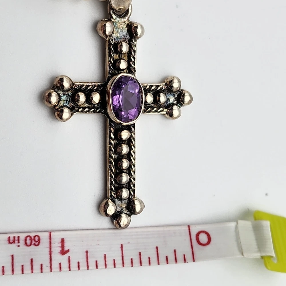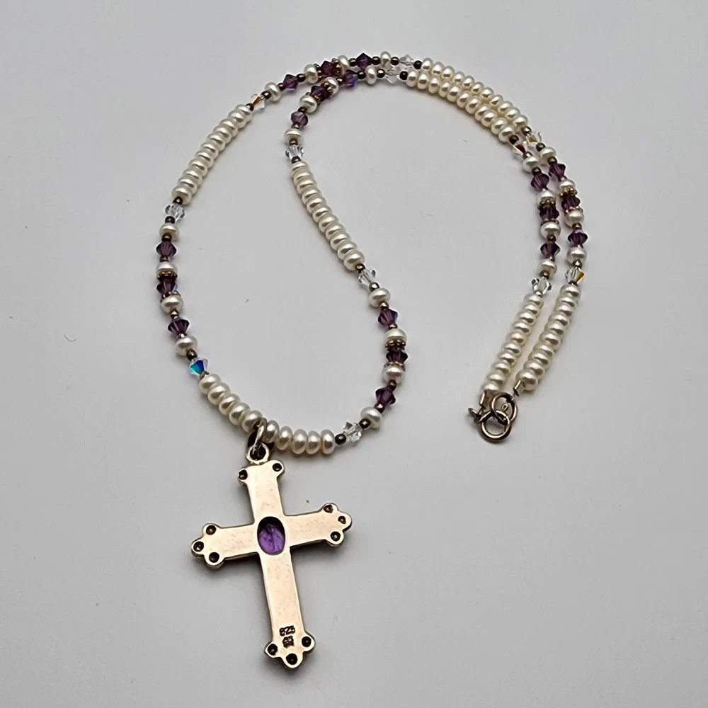 Sterling Cross Bezel Set Amethyst Pendant Button Pearl Crystal Necklace Handmade This Is A Signed Piece. I Cannot Identify the Maker. Beautiful Piece. Beads Are 4mm