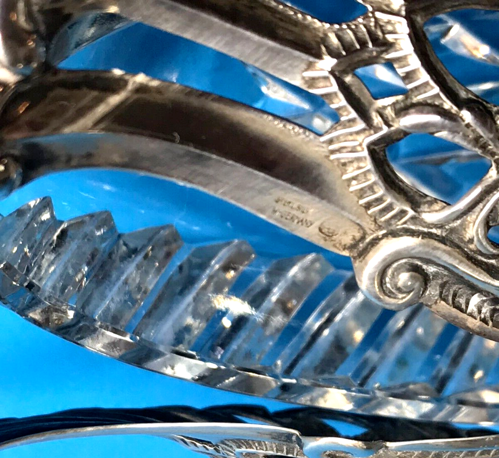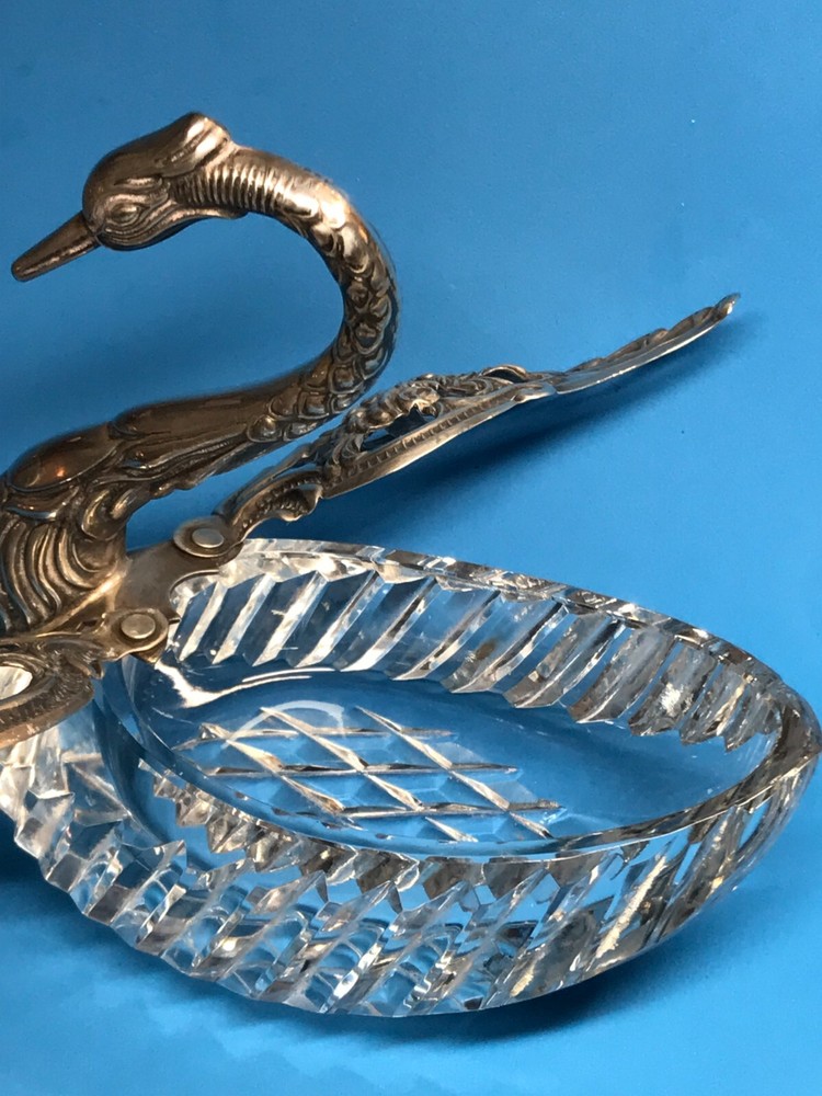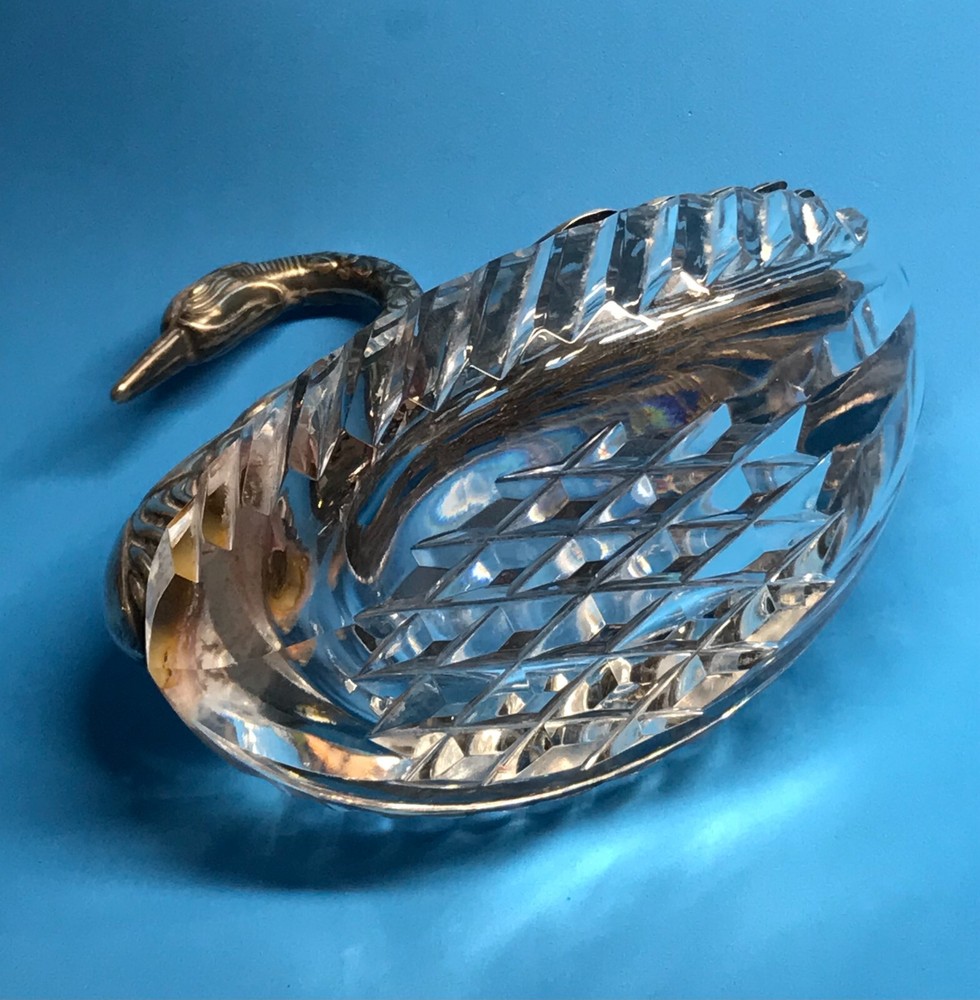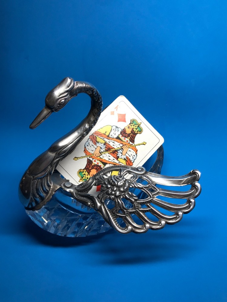 FROM MADEIRA WITH LOVE....! Found in an estate liquidation on the island of Madeira in Portugal, that of a retired antiques dealer. Vintage cut crystal and sterling silver swan bowl / dish that was found being used as a sugar bowl. Suited for use as a trinket catch all or to serve a condiment. The wings are pierced and articulated, moving side to side. One wing is stamped as illustrated, "Sterling, West Germany", hallmarked "AB" in a circle. Research came up with the maker associated with this mark, "August Betz, Schwabisch Gmund". Sitting on a table, it stands 4 3/4 inches tall while measuring it from the chest to the tail feathers, 5 1/4 inches across. Previously owned, it remains in good used condition. No chips or cracks in the crystal while the silver component remains free of dents or repairs. Black with tarnish when found, it has only been lightly polished. I have inserted a standard size playing card in one photo as a reference for size. MUCH OBLIGED