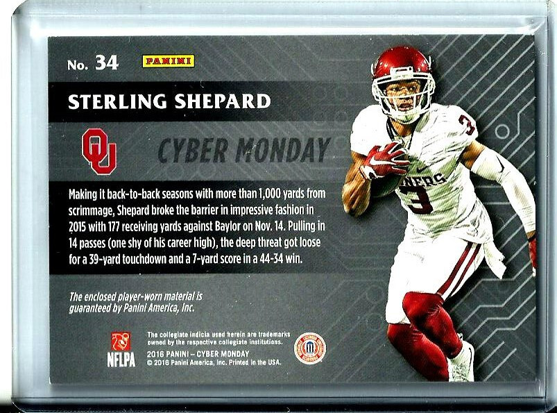 Features:Collectors Edition, Exclusive, Insert, RookieCard Size:StandardAutographed:NoTeam:Oklahoma Sooners, New York GiantsOriginal/Licensed Reprint:OriginalSport:FootballSeason:2016Set:2016 PaniniCard Number:34Type:Sports Trading CardManufacturer:PaniniLeague:National Collegiate Athletic Association (NCAA)Vintage:NoMaterial:Card StockParallel/Variety:RelicPlayer/Athlete:Sterling ShepardYear Manufactured:2016Country/Region of Manufacture:United States