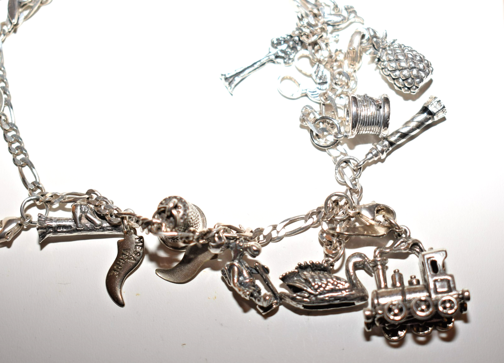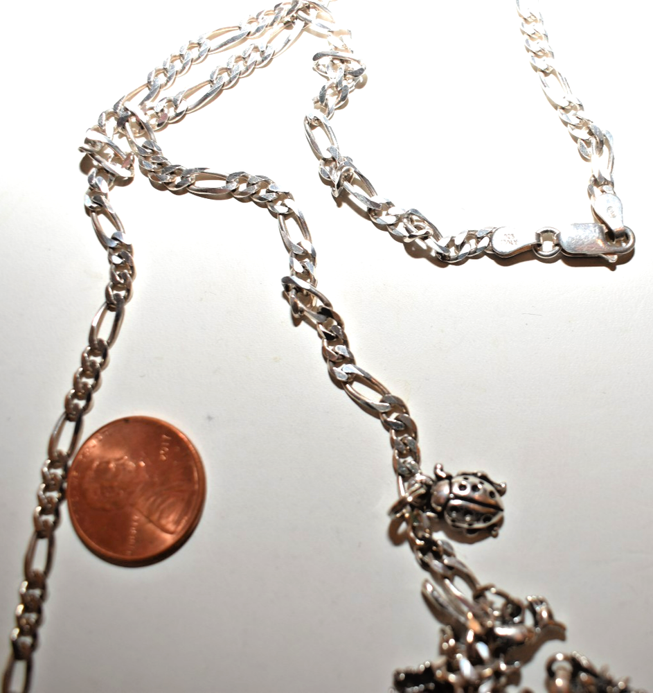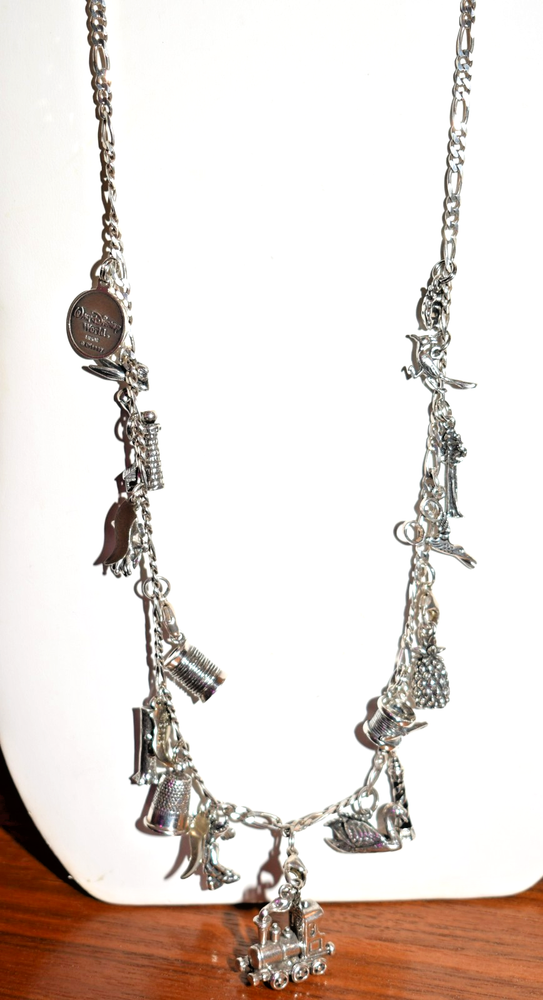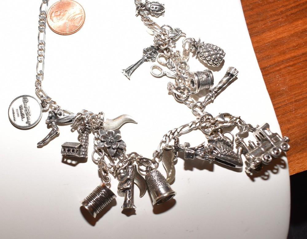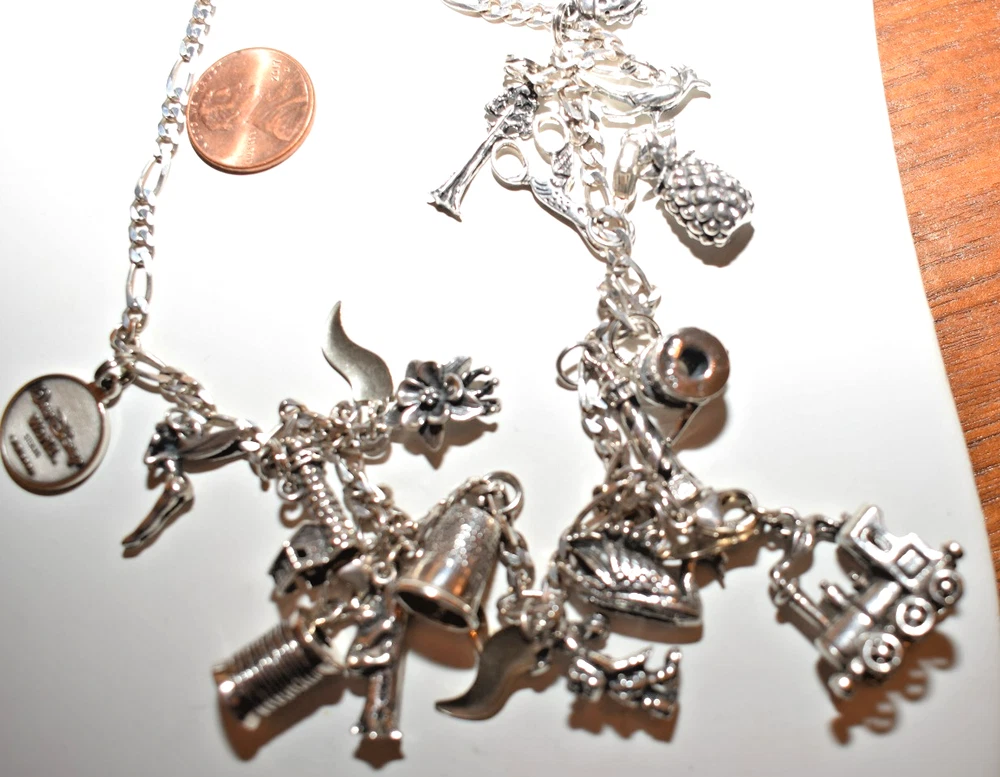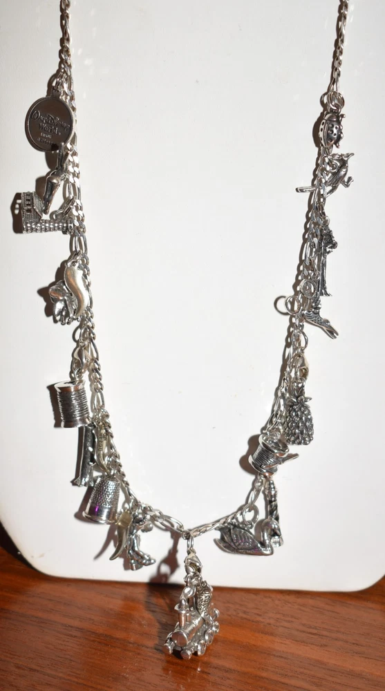 Am selling my 30 inch sterling silver charm necklace with numerous, sterling silver charms. The bottom charm in the middle is the largest and heaviest charm, a railroad steam engine from Durango, Colorado, with a circled C (copyright) stamp on the inside. It tests sterling. There's a large thimble marked "REG" and "925" inside, a spool of thread marked "925" with what looks like "AMER", a gorgeous moose with a backpack marked "925" and 3 initials I can't read, a spool of thread with a needle marked 925 and 3 initials I can't read, a moose, a bear climbing a tree (marked "sterling" on one side of the tree), a swan marked "925 REG" on the inside of its back, a roadrunner, a lighthouse marked "925" with a "J", a ladybug, a pineapple with marks that are unclear, Colorado's national flower, the columbine, (marked "ster" and some initials I can't read), a tall sequoia marked up one indentation of its trunk, a Tinkerbell from Disney (marked "ster" on the edge of one wing and copyright Disney on the other), and a year 2000 Walt Disney World charm that prominently reads "Sterling." This charm necklace exudes a classic yet whimsical style. The silver adds elegance to any outfit, making it a versatile accessory for any jewelry collection. Perfect for those who appreciate unique and stylish pieces that tell a story, this charm necklace is sure to make a statement. Length of chain is just under 30 inches; weight is 2.507 ounces, and if the war gets back enough, just sell a charm to pay for the groceries. Ground Advantage.