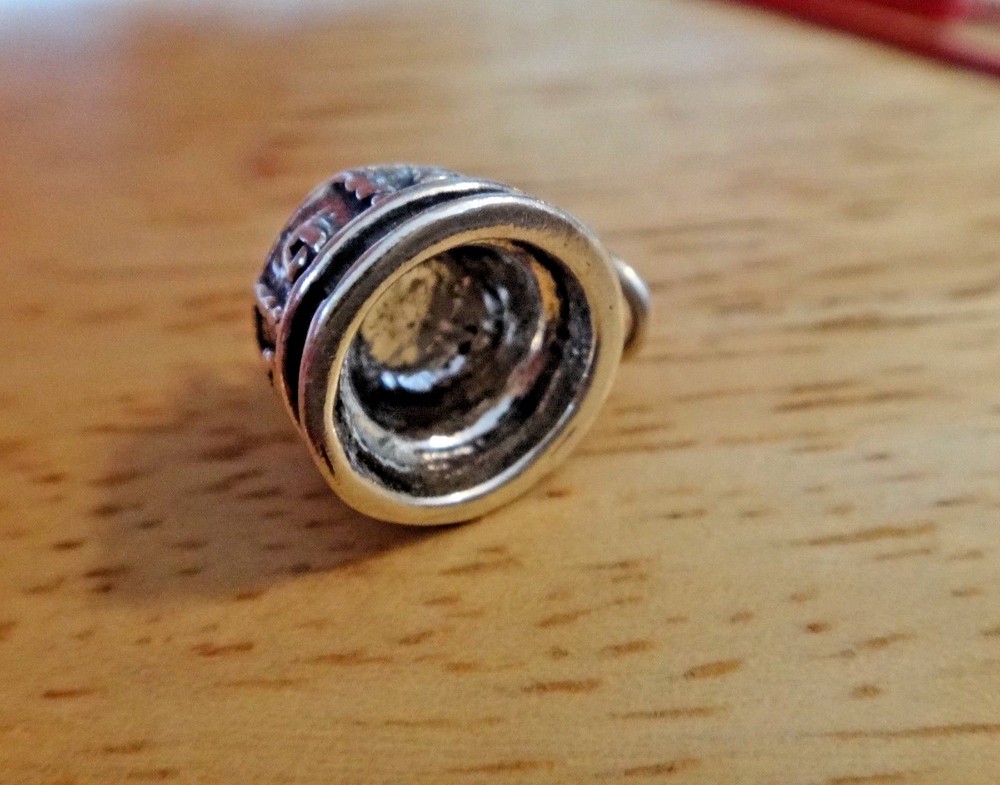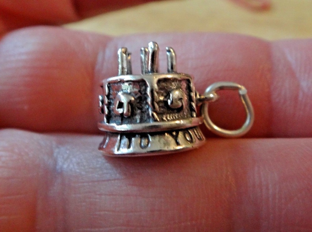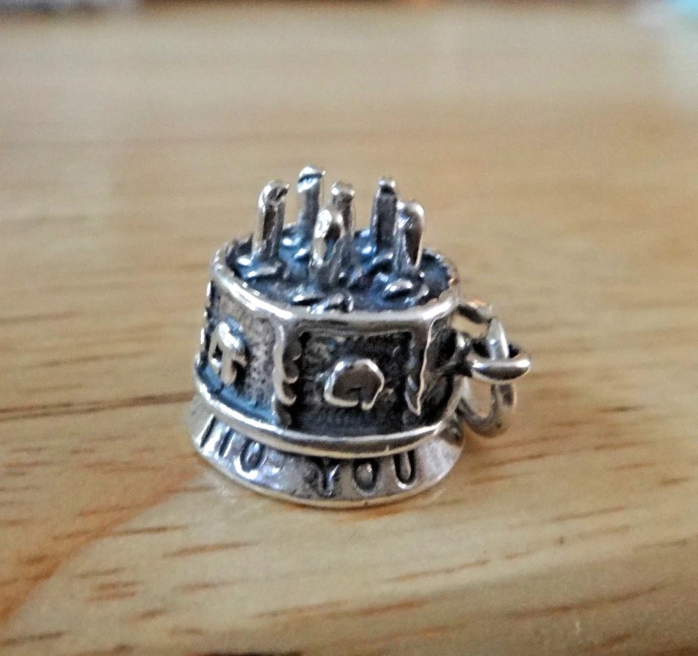 This new sterling silver large decorated birthday cake charm is 3D and says Happy Birthday around the bottom! It has 6 candles on the top and would be perfect for a Birthday gift! The charm is about 13 mm in diameter and 13 mm thick. It is hollow on the bottom. I also have many other items such as 100 different stud earrings as well as bracelets, chains, and over 6000 other charms.