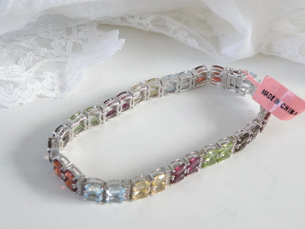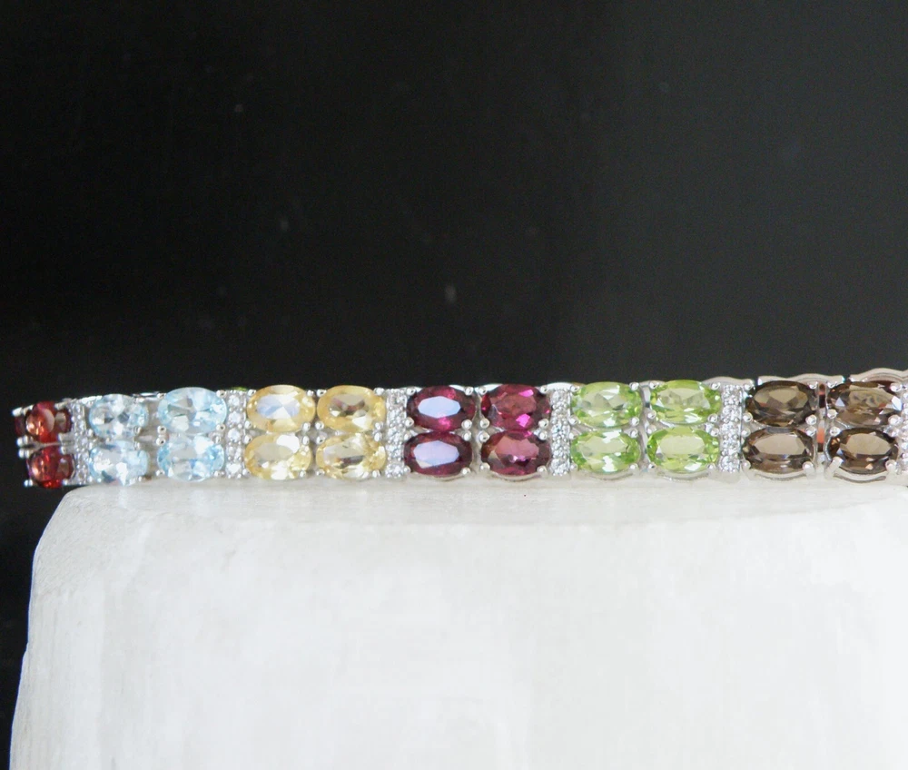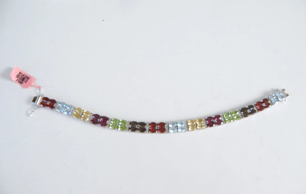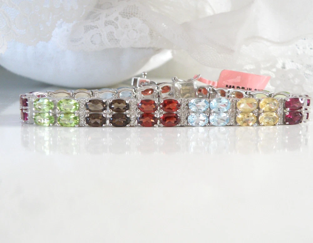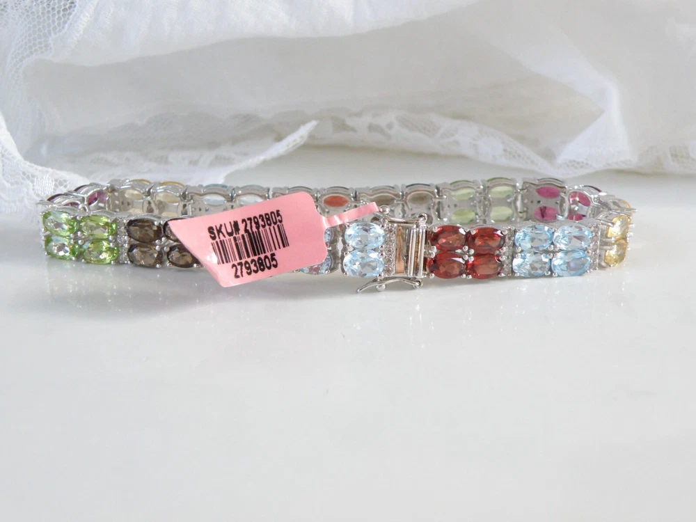 A double row of romantic and dreamy gemstones in this fantastic sterling silver tennis bracelet. White topaz small accents separate each section in groups of 4 gems. An oversized box clasp with double safety guard. New with tags. $489 retail. May have light tarnish from being stored. Marked 925 for sterling silver Measures approx 8.5" long end to end - 8-3/8" with the clasp closed x .35" wide Weight 24.9 grams - light weight