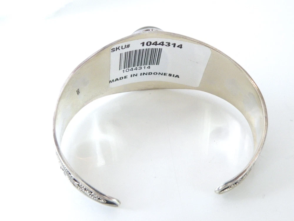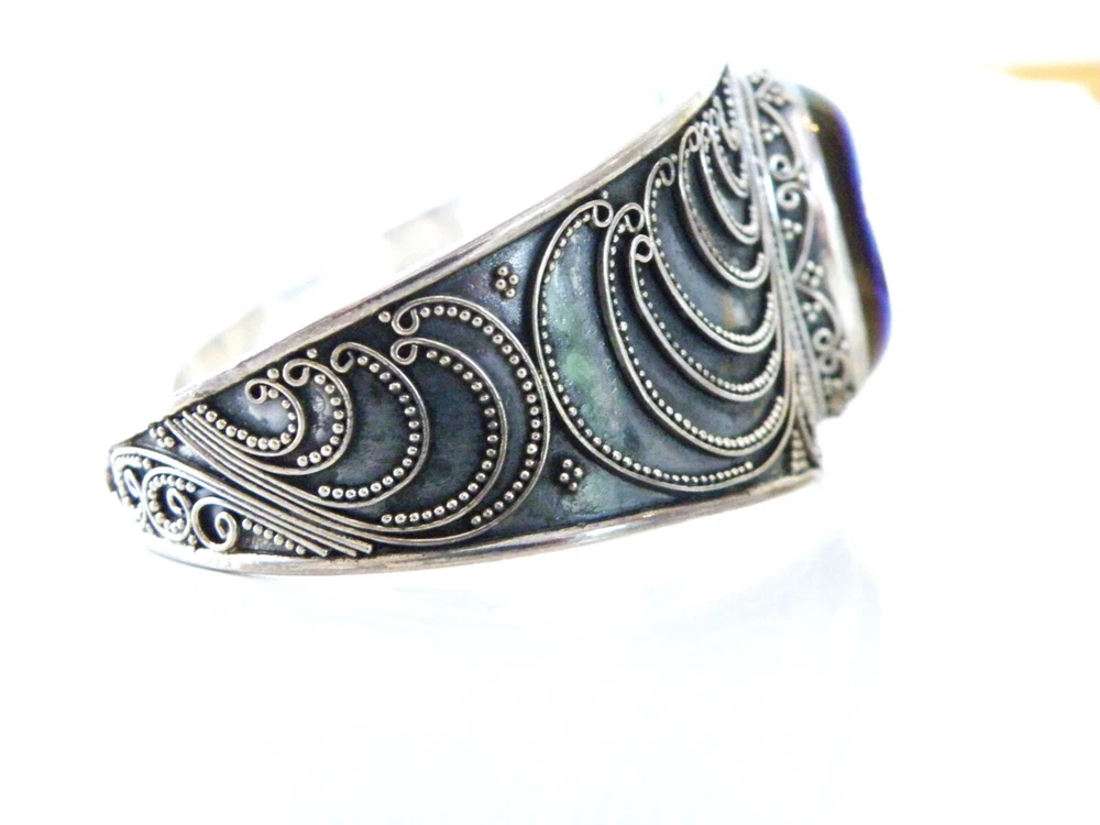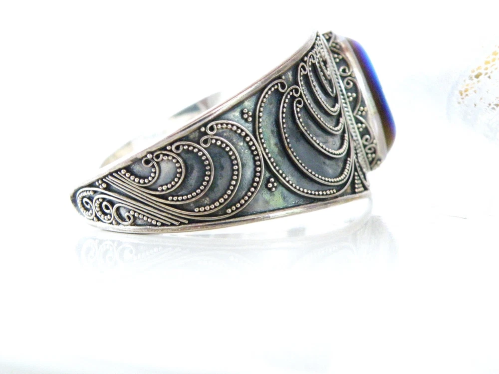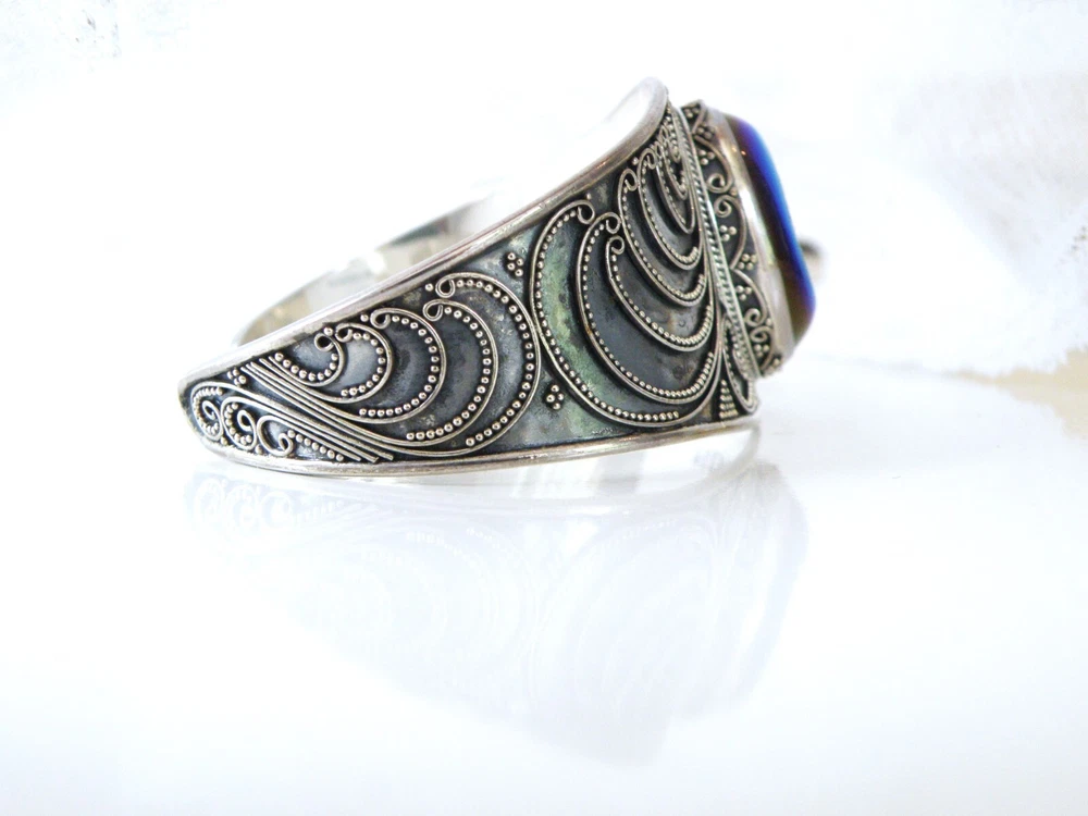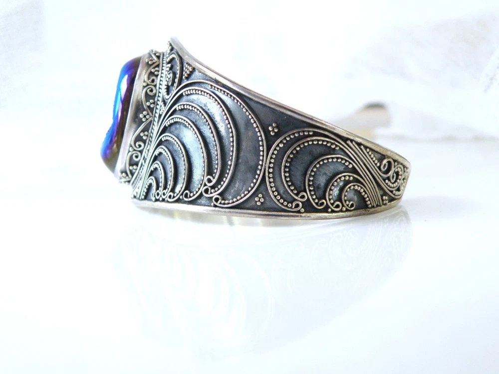 When it’s time to party, you need a fun bracelet, and this is it! This fabulous chunky sterling silver wrap cuff bracelet showcases a very slick design with an electric blue drusy crystal and beadwork that is meticulously placed. The gap opens to accommodate a size up or down. WEIGHT: 33.6 grams - nice weight MEASURES APPROX: 7.5" inside or 2- 1/2" across the top x 1.32" top to bottom of the widest area MARKINGS: '925' for sterling silver and there might be a maker's mark under the retail sticker
