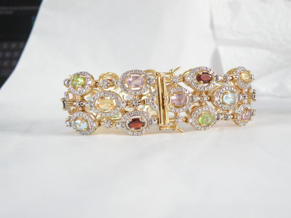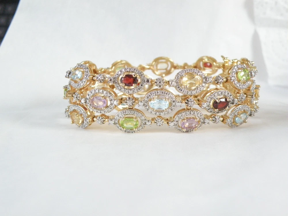 Liven up your jewelry wardrobe with this colorful alternative to a traditional tennis bracelet. Featuring a stunning signature piece with 3 rows of sparkling gemstones. A very well constructed tennis bracelet. A tight box clasp with a double safety guard. Composed of yellow gold over sterling silver. Weight 37.8 grams Measures approx. 7-1/2" long end to end. 7-1/4" with the clasp closed x .90" widest Stones measure approx. 6-mm-x 4-mm Marked 925 for sterling silver 'China R' for the maker's mark