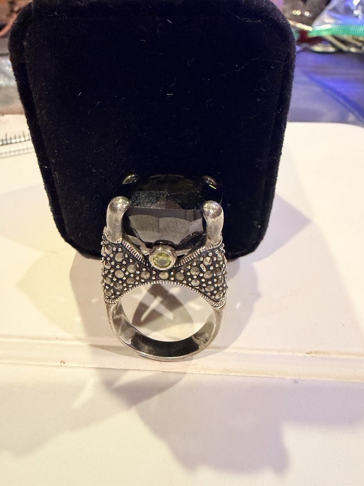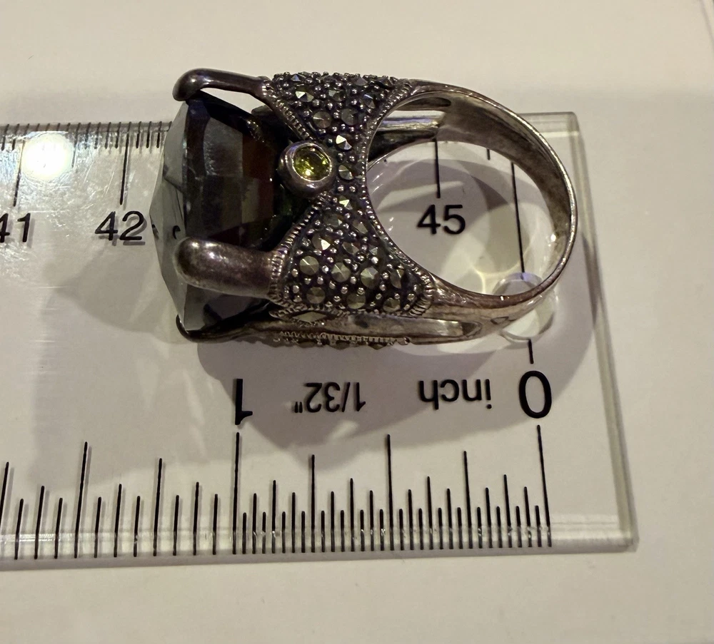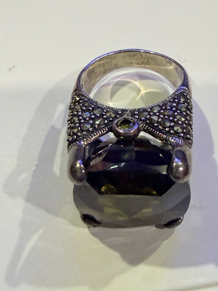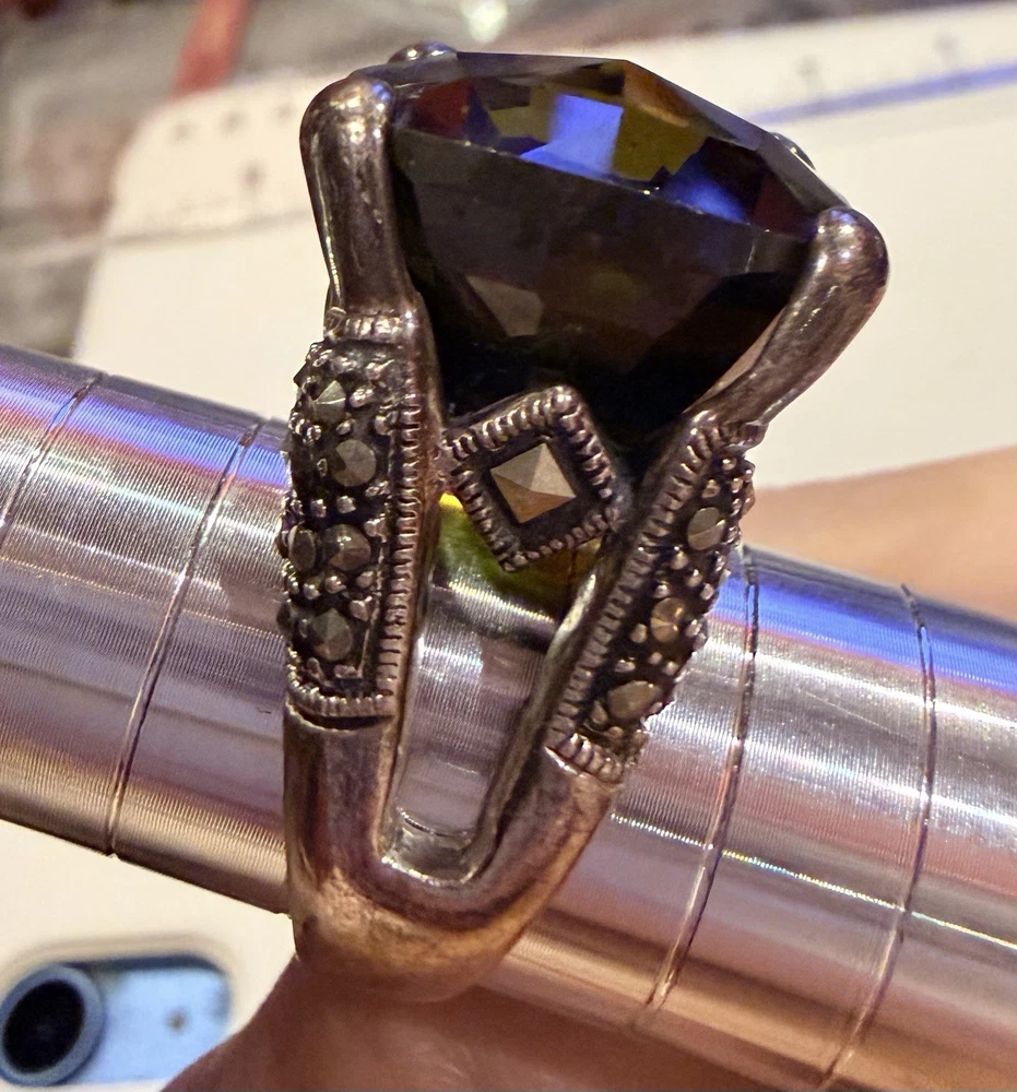 ✨ STUNNING STATEMENT RING ✨ Dramatic sterling silver cocktail ring featuring an absolutely gorgeous large cushion-cut smoky quartz centerpiece surrounded by intricate marcasite detailing in a vintage Art Deco inspired design. 💎 DETAILS: • Sterling silver (stamped 925) • Large smoky quartz center stone (est. 25-30+ carats) • Marcasite accents with decorative bow motif • Peridot or citrine accent stone detail • Elaborate openwork gallery & sides • Size approx. 7.5-8. See pictures • Substantial weight - quality piece 🖤 STYLE: Perfect for making a statement! This ring has serious presence with its large gemstone and vintage-inspired design. The smoky quartz has beautiful depth and the marcasite sparkle adds incredible dimension. Ideal for cocktail parties, special occasions, or elevating everyday style. 📸 CONDITION: Good pre-owned condition with typical silver tarnish in crevices (easily cleaned). All stones secure. #statementring #smokyquartz #marcasite #sterlingsilver #artdeco #vintagestyle #cocktailring #gemstone #gothic