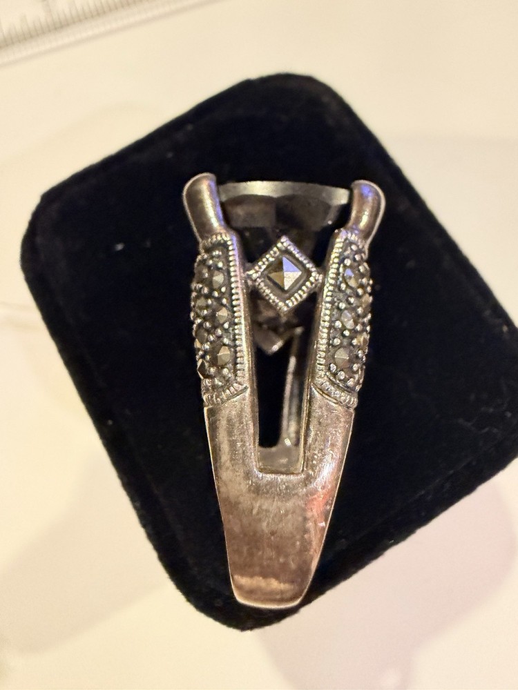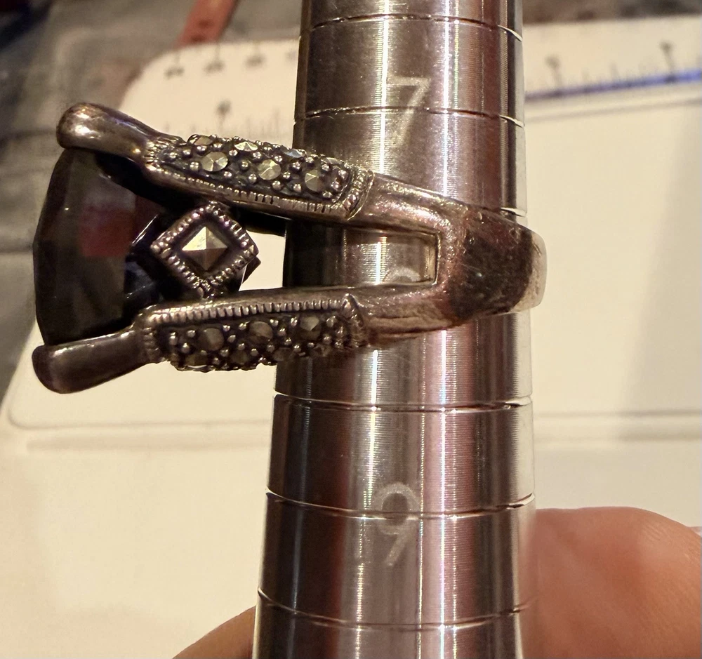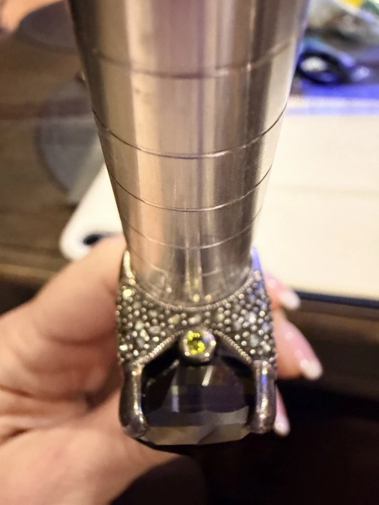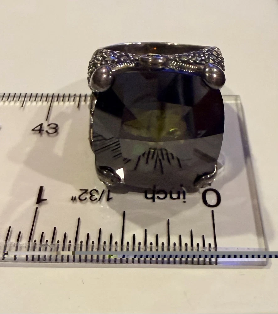 ✨ STUNNING STATEMENT RING ✨ Dramatic sterling silver cocktail ring featuring an absolutely gorgeous large cushion-cut smoky quartz centerpiece surrounded by intricate marcasite detailing in a vintage Art Deco inspired design. 💎 DETAILS: • Sterling silver (stamped 925) • Large smoky quartz center stone (est. 25-30+ carats) • Marcasite accents with decorative bow motif • Peridot or citrine accent stone detail • Elaborate openwork gallery & sides • Size approx. 7.5-8. See pictures • Substantial weight - quality piece 🖤 STYLE: Perfect for making a statement! This ring has serious presence with its large gemstone and vintage-inspired design. The smoky quartz has beautiful depth and the marcasite sparkle adds incredible dimension. Ideal for cocktail parties, special occasions, or elevating everyday style. 📸 CONDITION: Good pre-owned condition with typical silver tarnish in crevices (easily cleaned). All stones secure. #statementring #smokyquartz #marcasite #sterlingsilver #artdeco #vintagestyle #cocktailring #gemstone #gothic