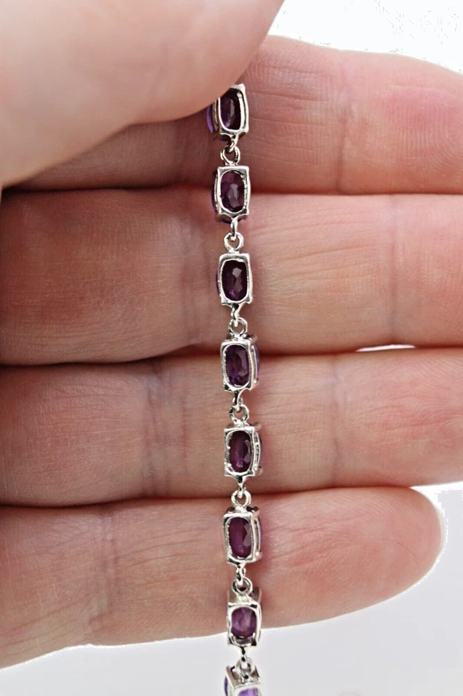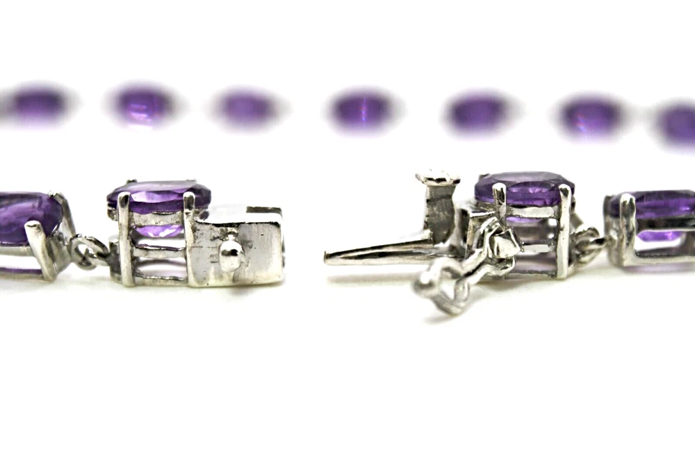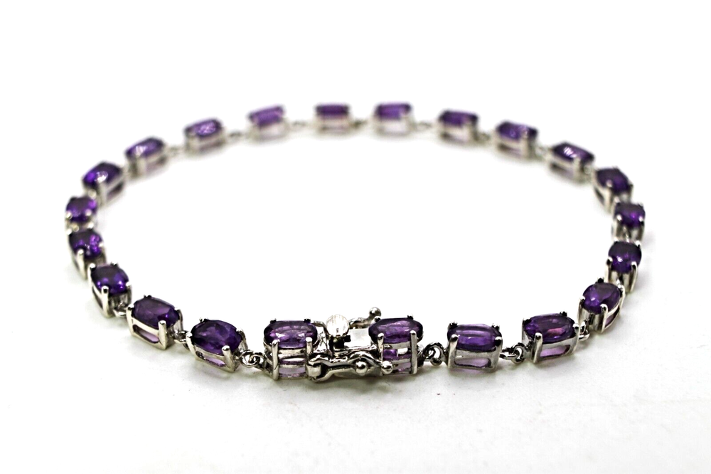 Solid sterling silver 925 stamped white rhodium coated bracelet featuring oval cut faceted genuine natural mined purple amethyst gemstones each measuring 6mm x 4 mm set into a simple tennis style bracelet with a slide fastening and figure of eight safety clasp each side. The bracelet measures 8 inches long by 5mm wide. Total weight 9.24 carats / 12g GIFT BOXED Thanks for looking and please take time to view my other listings #17970