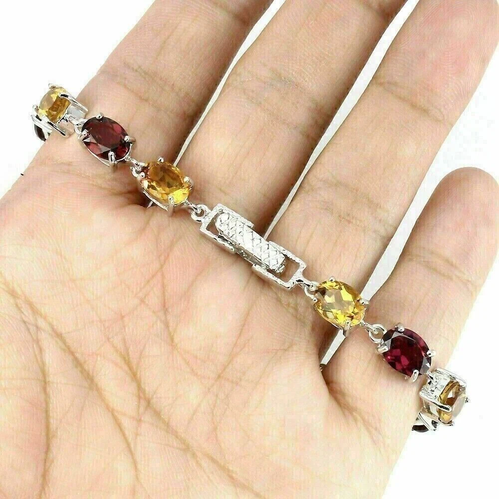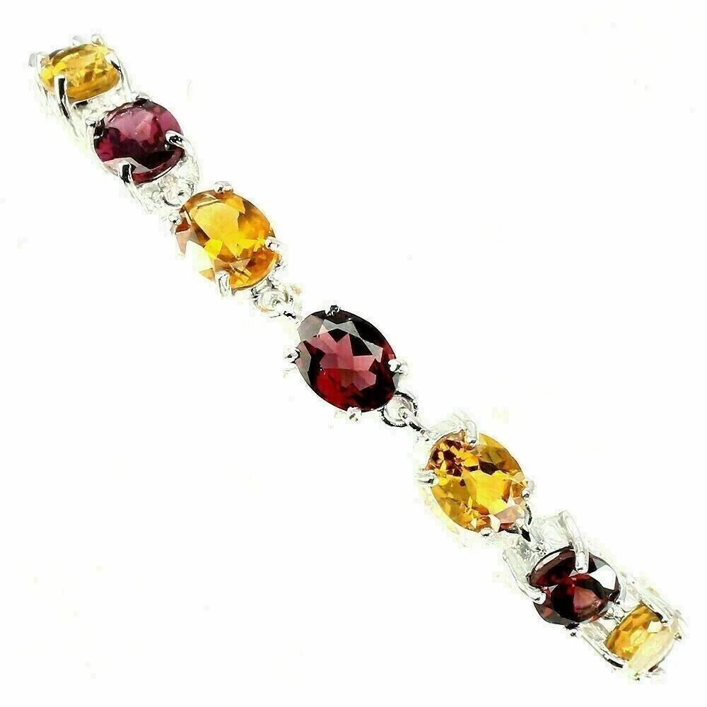 Solid sterling silver 925 stamped white gold coated bracelet featuring oval cut faceted genuine natural mined raspberry pink rhodolite and golden citrine gemstones, each measuring 8mm x 6mm set in alternating design to form the bracelet. The bracelet measures 19cm 7 1/2 inches and is completely set with stones apart from the clasp. Total weight 19g / 8.2 carats GIFT BOXED Thanks for looking and please take time to view my other listings #13586