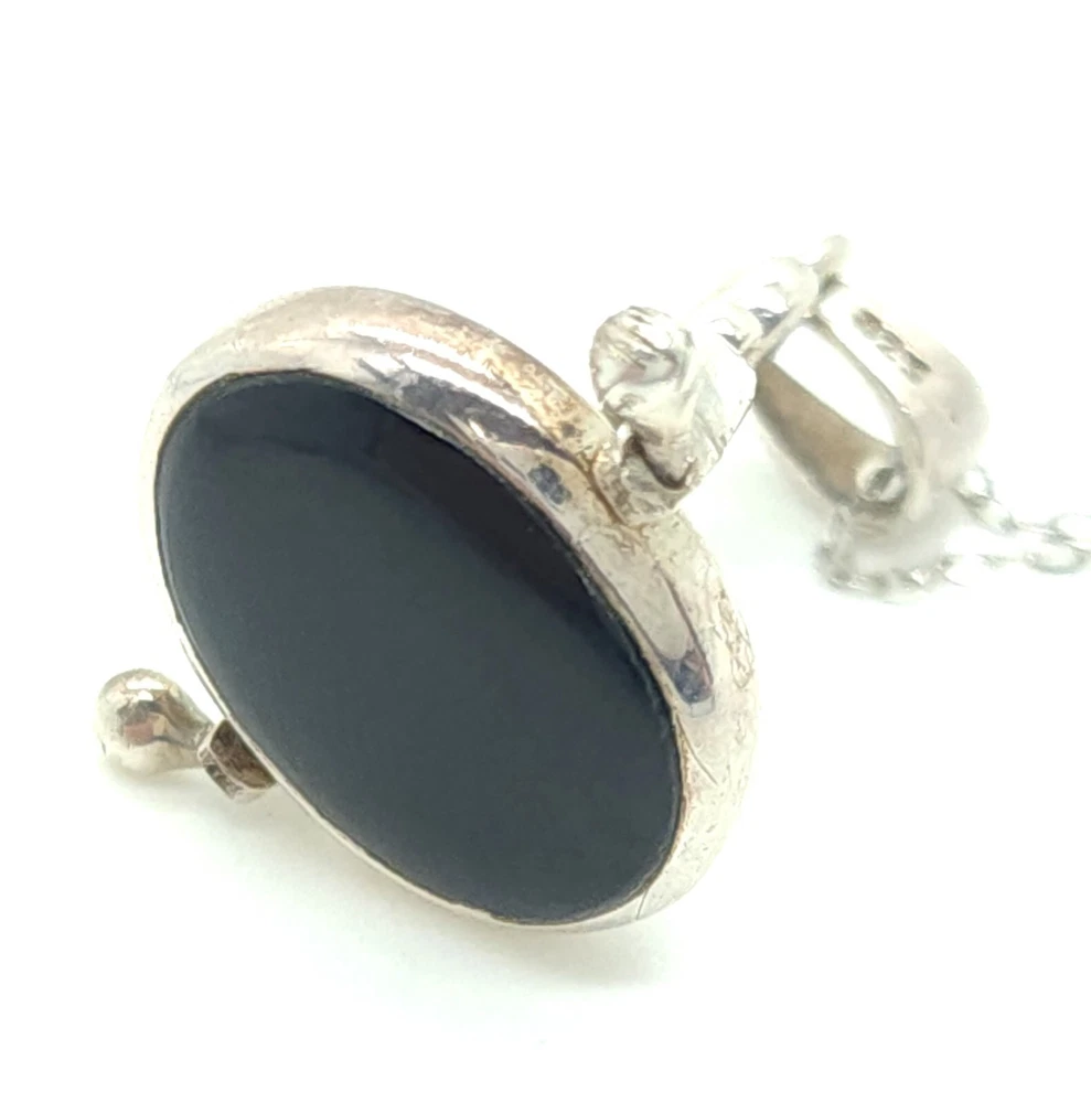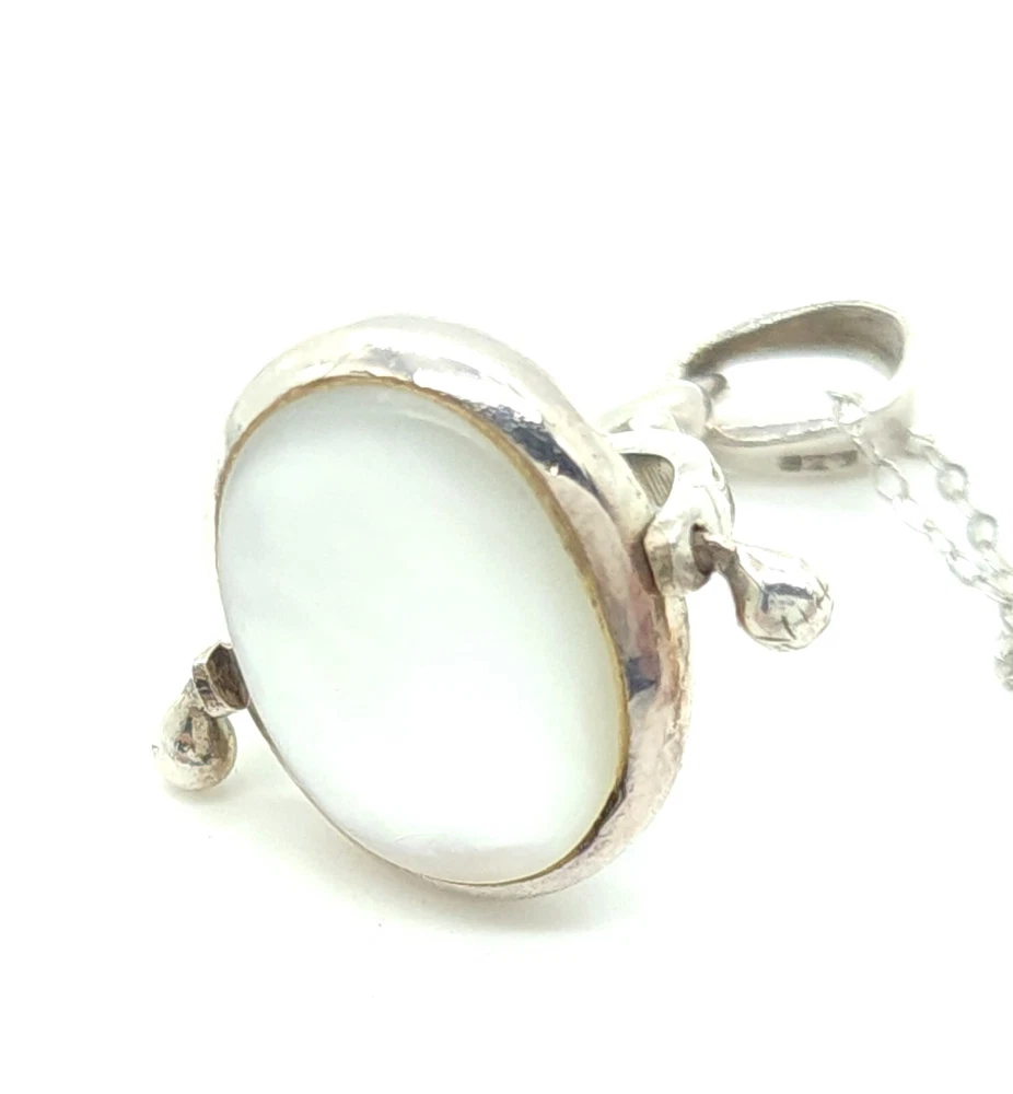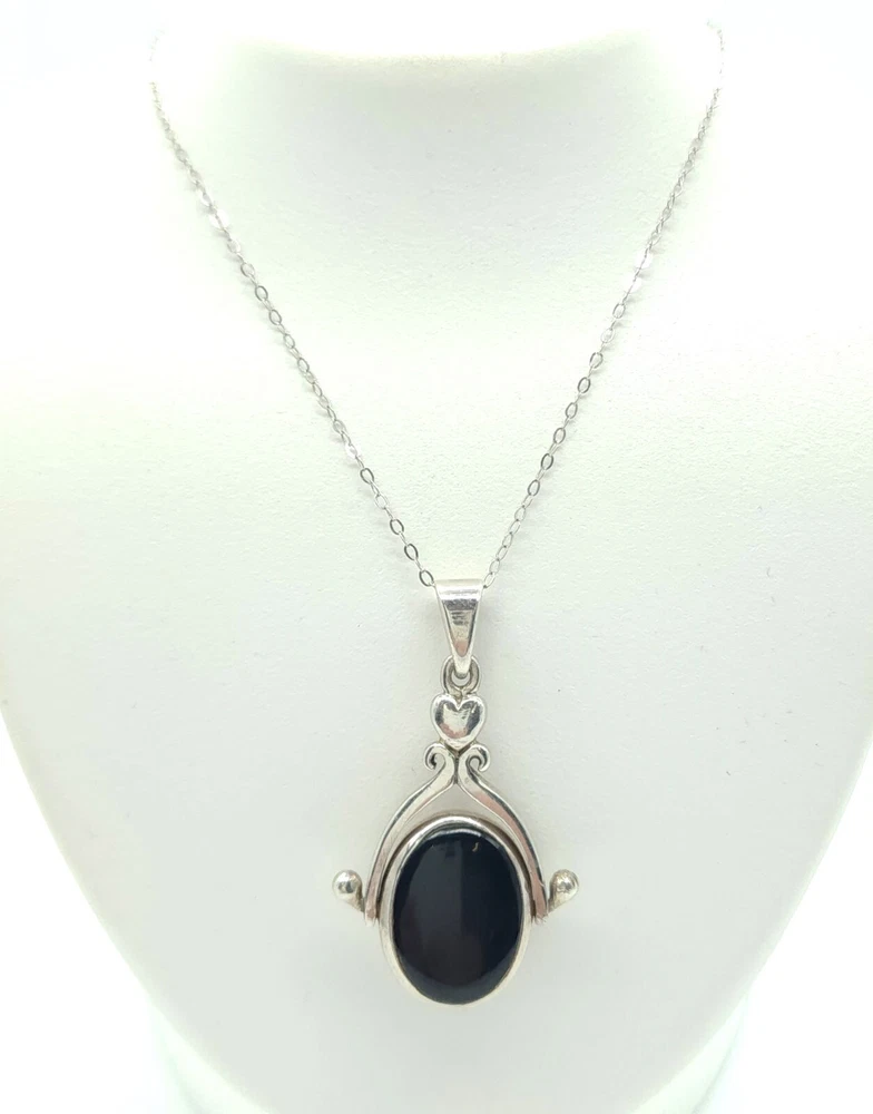Sterling Silver Chain with Black Onyx & Mother of Pearl Reversible Pendant Size: 18" Long X 1.0mm Wide Pendant: 1.42" Tall (with bail) X 0.81" Wide X 0.25" Thick Stones: 0.57" Tall X 0.42" Wide 3.77dwt 5.87g 0.21oz ** Stamped & Tested A. EE / U. EE