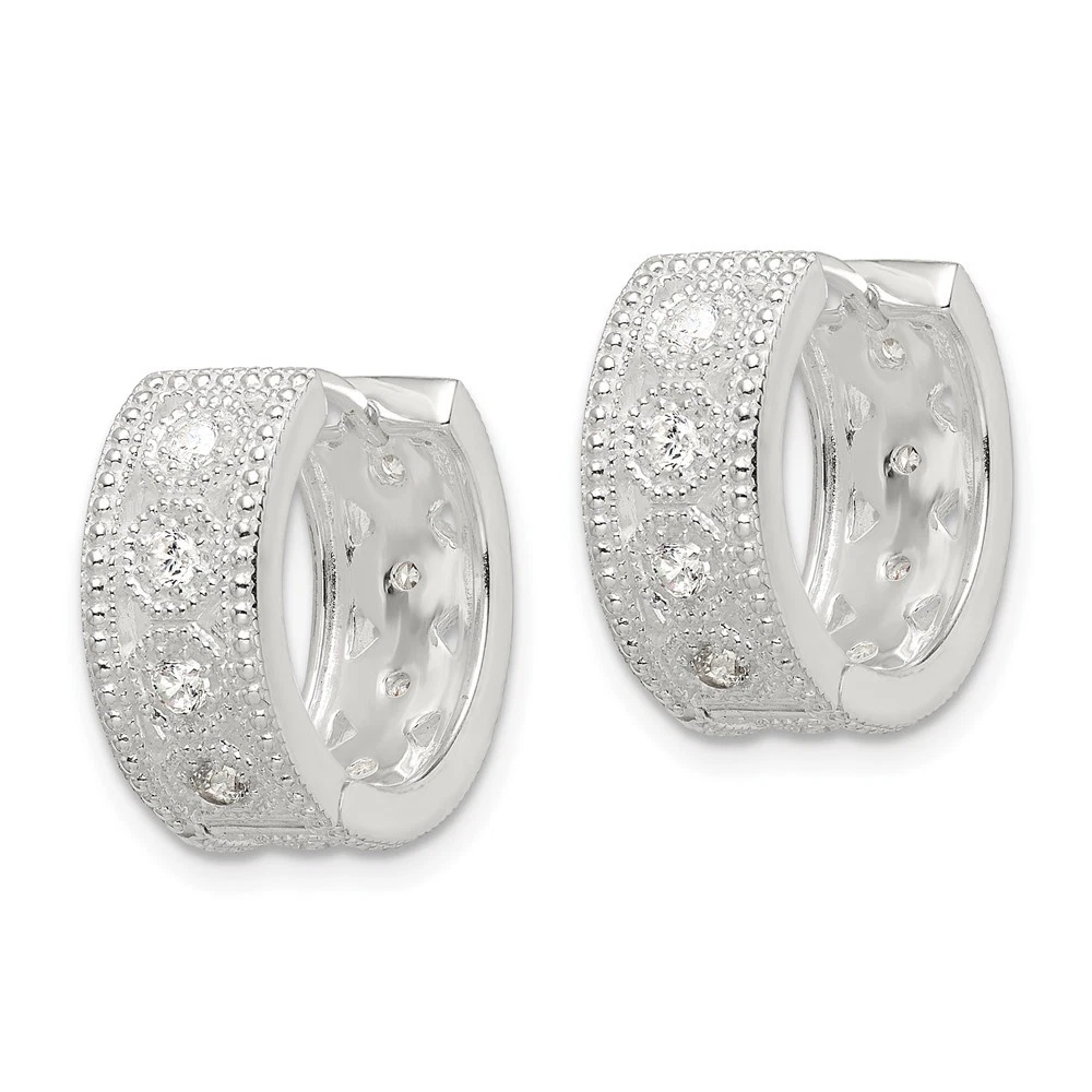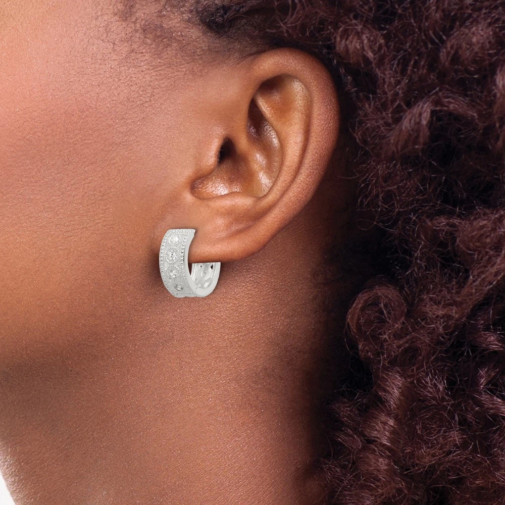 Material: Primary - Purity:925|Finish:Polished|Stone Type_1:Cubic Zirconia (CZ)|Stone Color_1:White|Stone Quantity_1:18|Length of Item:17 mm|Coating:Anti-tarnish|Feature:Hinged|Material: Primary:Sterling Silver|Completeness:Complete (all stones included)|Stone Shape_1:Round|Stone Treatment_1:Synthetic|Thickness:6.88 mm|Width of Item:17.16 mm|Product Type:Jewelry|Jewelry Type:Earrings|Sold By Unit:Pair|Gender:Women's|Texture:Textured|Material: Primary - Color:White|Earring Closure:Post, Notch & Lock|Earring Type:Hoop|Stone Creation Method_1:Synthetic|Earring Style:Hinged / Huggie All weights and measurements are approximate and may vary slightly from the listed information. Welcome to diamond_6720 Payments We accept all Ebay approved payment. Please sent the payment to us within 8 days after the auction has ended, or you will have unpaid case auto open by eBay. Shipping Policy We will ship all items within 1 business days of purchase during the work week (M-F) excluding holidays. If you order on Friday, your order will be shipped the following business day. Tracking will be provided when it becomes available. We will only ship to a PayPal Verified Address. Please make sure your address is current and correct. If the information does not match, your order may be canceled. Buyers are responsible for all customs, duties and taxes for your respective countries. Delivery times for International Shipping will vary. California Buyers Pay 9.0% Tax on all orders. case auto open by eBay. Return Policy & Exchange Returns or Exchange are accepted. Buyer must contact us within 30 days after the item is received. Item must be returned in unworn and resalable condition. We will only issue a refund for the purchase price, excluding any shipping fees. If we are at fault, we will provide a full refund. Buyer is responsible for all return shipping costs. BUYERS FEEDBACK If you have any concerns regarding your purchase, please contact us via eBay Message, we assure you that a satisfactory resolution will be reached. Your feedback is very important to us Do remember to give us 5 star rating(*****) if you are satisfied with our product & service .