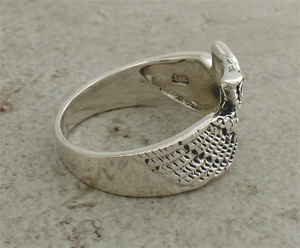 DETAILS ring size 8 dimensions 12mm(1/2") tall front approximate weight 5.0 grams retail value $55.00 part no. r1815 you are bidding on a unique sterling silver owl ring. This unique ring has a large detailed owl on the front with its wings down the sides. A great ring for the owl lover. The owl measures 12mm(1/2") tall with the sturdy band tapering down to 4mm wide in the back. This ring also has a beautiful high polish finish that will complement anything in your silver collection.