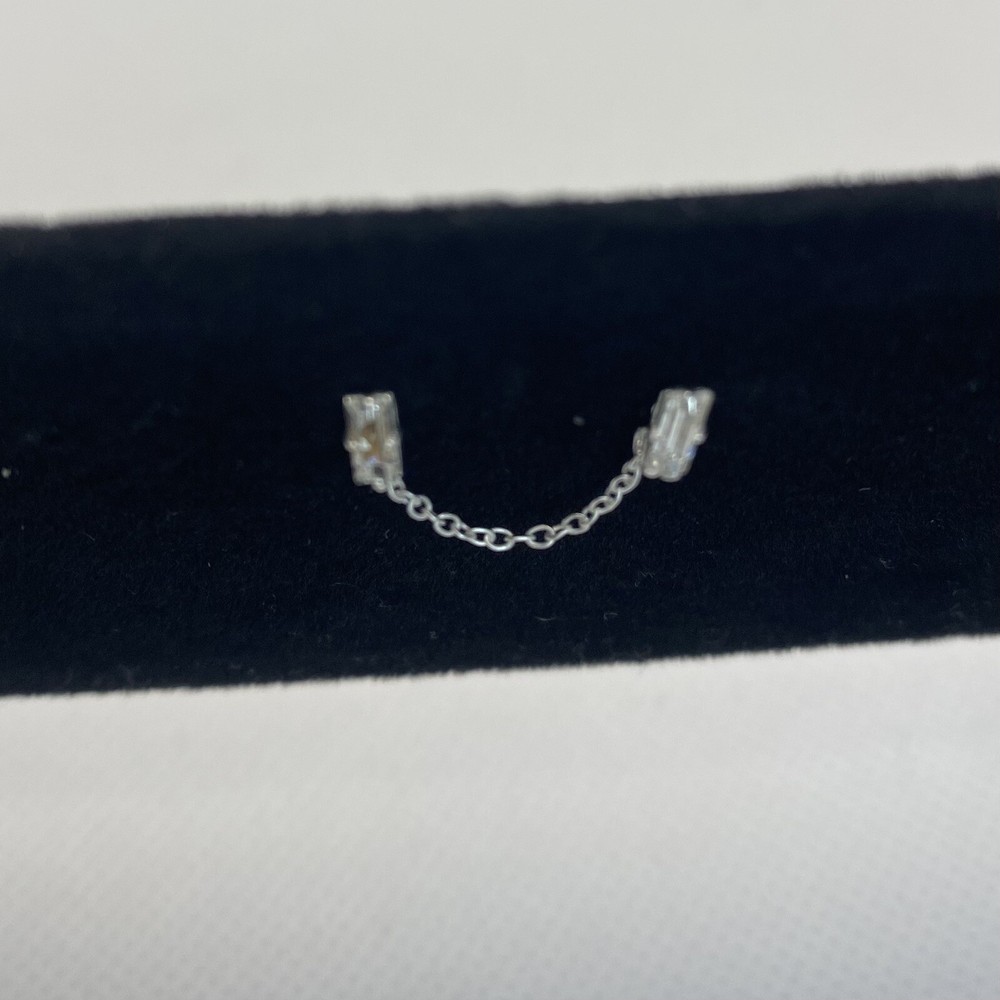 Sterling Silver White Crystal Baguette Double Stud Earring w/ Chain Womens Teens See photos for the actual item available. Feel free to contact me with any questions. This beautiful sterling silver earring features double baguette-cut crystal studs connected by a delicate chain. The earring is perfect for any occasion, from weddings to birthdays to Mother's Day. The butterfly closure ensures a secure fit, while the prong setting style adds extra elegance to the design. This earring is made of 925 sterling silver, ensuring their quality and durability. The crystal gemstones are simulated and measure 30mm in width and 4mm in length, with a depth of 1mm. This earring is versatile and can be worn on the cartilage or lobe of the ear. Express your love for beauty, art, and fashion with this stunning double piercing earring. Shop our store with confidence as we offer 30-day returns on all purchases. Additionally you can save money by making multiple purchases to take advantage of our discount shipping policy. You will pay the highest shipping cost for a single item in your cart and $3 for each additional item.