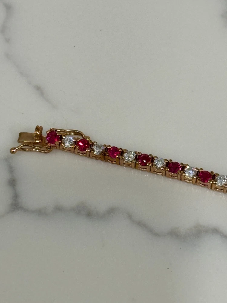 This stunning bracelet is the perfect addition to any jewelry collection. With a beautiful red and clear cubic zirconia stone, this bracelet is sure to catch the eye. The 7.25" tennis style bracelet is made of high-quality 925 silver, making it a durable and long-lasting piece. The bracelet is perfect for any occasion, whether it's a night out on the town or a casual day at work. The white main stone color complements the red stone, making it a versatile piece that can be paired with any outfit. Don't miss out on the chance to add this gorgeous bracelet to your jewelry collection.