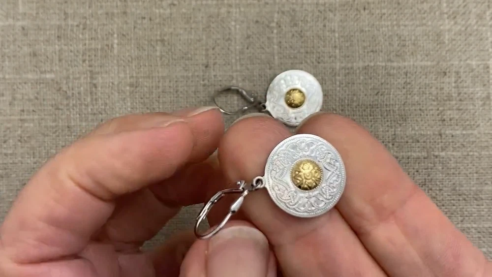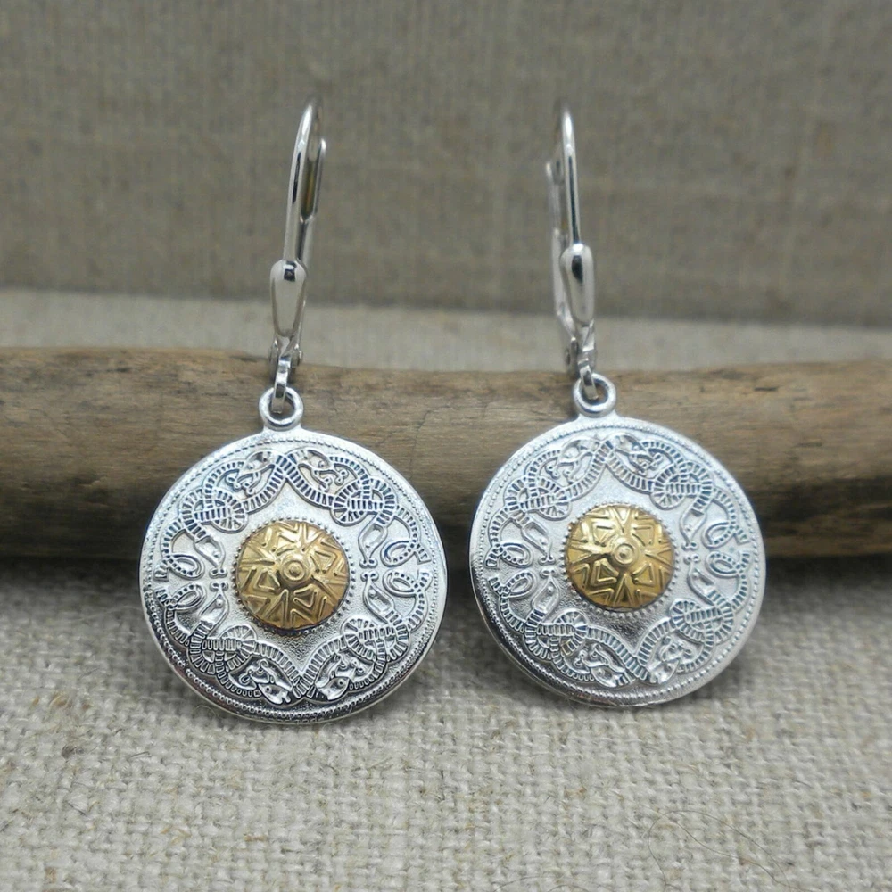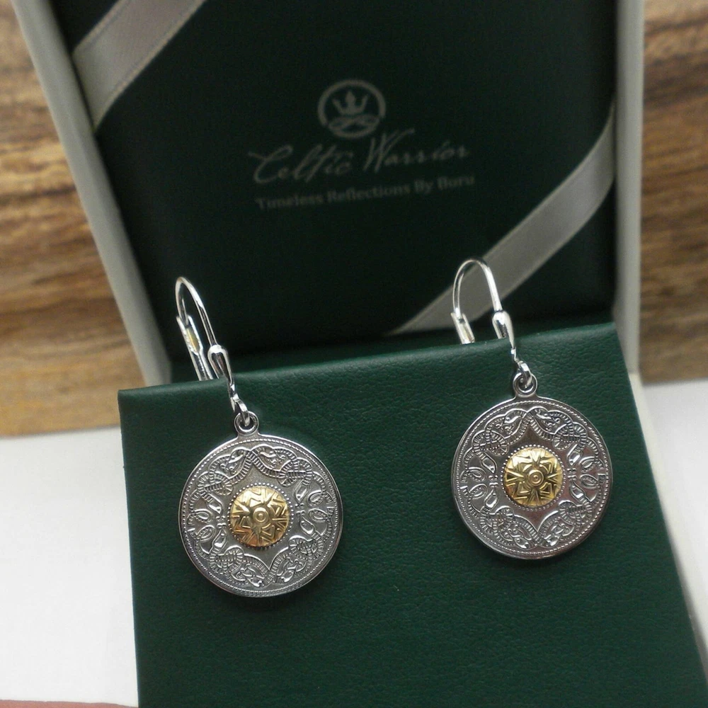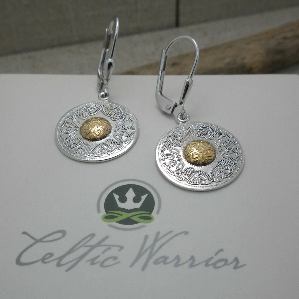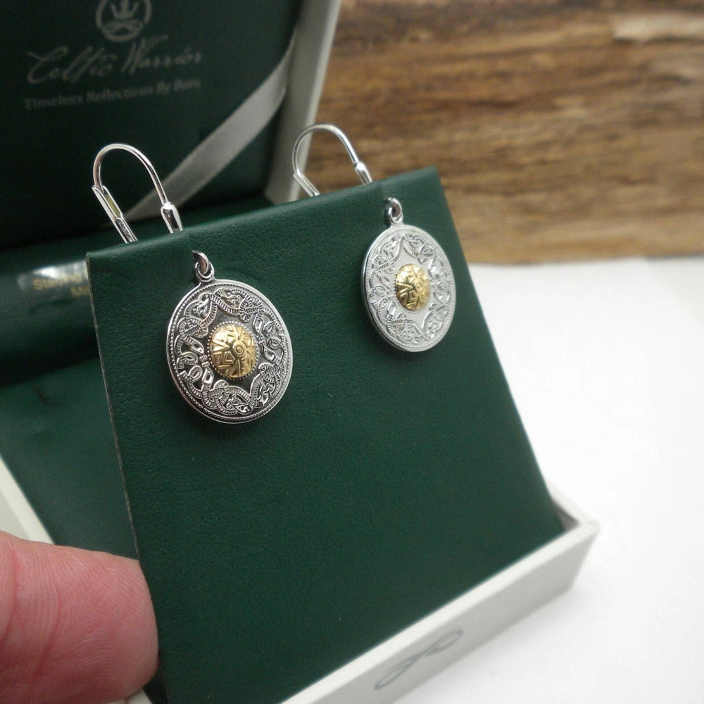 Small Sterling Silver Celtic Warrior Shield Earrings with 18K Bead Made in Ireland by Boru Sterling Silver Celtic Earrings Beautiful textured sterling silver Irish made Small Celtic Warrior Shield Earrrings with 18K Center Bead Each earring measures 5/8" Round Leverback Closure Made in Ireland. Beautifully Boxed with Cleaning Cloth