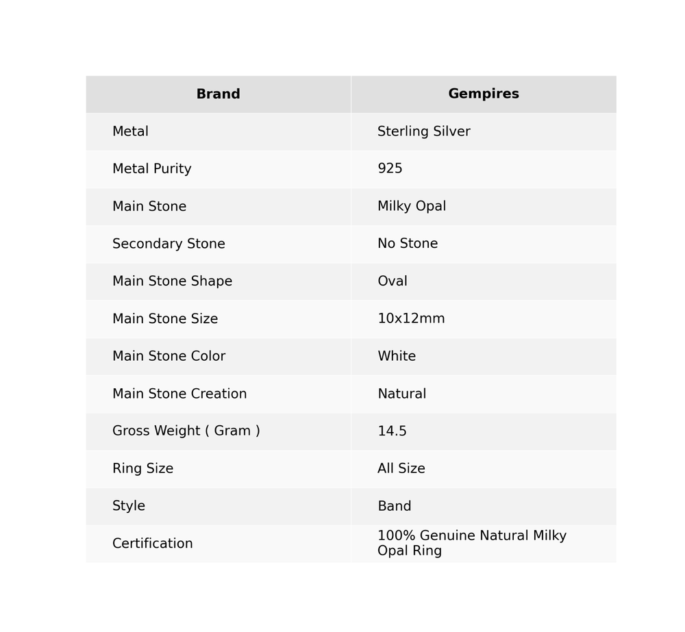 Welcome To Our Shop Gempires ------------------------------------------- With a very minimalist design yet attractive approach, this Ring would be the best choice to gift someone you love. It features luscious 925 Sterling Silver with adornment of glitzy Milky Opal. Don't wait to get this superb jewelry piece. Sterling Silver Natural Milky Opal Wife October Birth Band Ring Size All Size Check My Other Ring Listings : Click Here SKU:- RR-53-20 Metal:- Sterling Silver Metal Purity:- 925 Gemstone:- Milky Opal Gemstone Color:- White Gemstone Shape :- Oval Gemstone Creation :- Natural Stone Setting :- Bezel Ring Size:- All Size US ___________________________________________________________________ Shipping Handling - Free Standard Shipping all over the world Handling Time - 2 to 5 BUSINESS Days Delivery Time - 7 to 20 Days ( Various on destination ) _________________________________________________________________ Returns - 1.We provide a 100% Money Back Guarantee, excluding shipping costs, within 30 days from the date of item receipt. 2.The item must not be altered or damaged in any way shape or form. 3.Upon receipt of the aforementioned items, your payment will be promptly refunded. 4.Please be so kind as to contact us via email in order to acquire comprehensive return instructions before proceeding with the return of the merchandise. 5.Kindly be advised to allocate a maximum period of 1 business day for the processing of all returns, in order for the appropriate credit to be applied. 6.Sizing does not affect the return policy. _________________________________________________________________ FAQ's - Q.1 ARE THE ITEMS YOU ARE SELLING BRAND NEW? We exclusively offer brand-new products, refraining from the sale of pre-owned jewelry. Our entire jewelry collection is composed of 100% natural, conflict-free pieces. We do not engage in the trade of imitation or lab-grown gemstones and diamonds. Q.2 WHAT ARE YOUR BUSINESS HOURS? we operate 24x7 as we have a dedicated team who works in different shifts to deliver the services to our valuable customers. ________________________________________________________________ Gempires is committed to delivering customers an unparalleled experience through the provision of exquisite handmade jewelry, meticulously crafted to uphold the most exacting standards of quality. Our operations encompass dual roles as both discerning connoisseurs and skilled artisans within the realm of jewelry making. We proudly hold an extensive proficiency in the fine art of enhancing gemstones, allowing us to harmonize them seamlessly with diverse aesthetic inclinations. We are delighted to extend to you the privilege of curating your very own jewelry collection. This collection will be graced by the presence of genuine and splendid natural gemstones, each possessing an innate authenticity and beauty that is truly unparalleled. **** STAY BLESSED ALWAYS*****