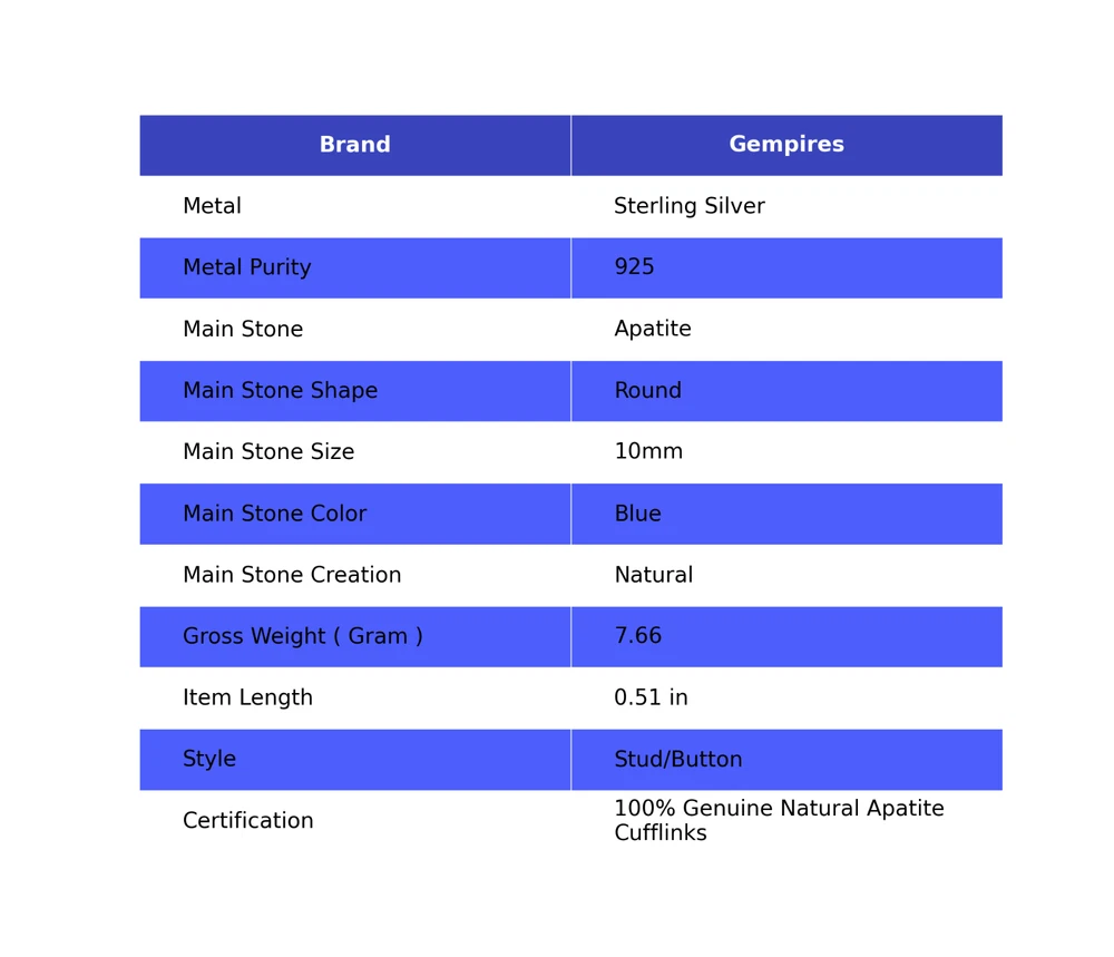 Welcome To Our Shop Gempires ------------------------------------------- Make your look hypnotic and charming with this classy Cufflinks studded with Apatite featuring fascinating alluring 925 Sterling Silver finish. Stylish floral design make it flamboyant and elegant that you can wear it on parties or on a special event. Sterling Silver Natural Apatite Blue Groomsmens Gift Designer Wedding Cufflinks Check My Other Cufflinks Listings : Click Here SKU: CL-3-12 Gemstone: Apatite Stone Shape: Round Metal : 925 Sterling Silver Length: 0.51 Inches ___________________________________________________________________ Shipping Handling - Free Standard Shipping all over the world Handling Time - 2 to 5 BUSINESS Days Delivery Time - 7 to 20 Days ( Various on destination ) _________________________________________________________________ Returns - 1.We provide a 100% Money Back Guarantee, excluding shipping costs, within 30 days from the date of item receipt. 2.The item must not be altered or damaged in any way shape or form. 3.Upon receipt of the aforementioned items, your payment will be promptly refunded. 4.Please be so kind as to contact us via email in order to acquire comprehensive return instructions before proceeding with the return of the merchandise. 5.Kindly be advised to allocate a maximum period of 1 business day for the processing of all returns, in order for the appropriate credit to be applied. 6.Sizing does not affect the return policy. _________________________________________________________________ FAQ's - Q.1 ARE THE ITEMS YOU ARE SELLING BRAND NEW? We exclusively offer brand-new products, refraining from the sale of pre-owned jewelry. Our entire jewelry collection is composed of 100% natural, conflict-free pieces. We do not engage in the trade of imitation or lab-grown gemstones and diamonds. Q.2 WHAT ARE YOUR BUSINESS HOURS? we operate 24x7 as we have a dedicated team who works in different shifts to deliver the services to our valuable customers. ________________________________________________________________ Gempires is committed to delivering customers an unparalleled experience through the provision of exquisite handmade jewelry, meticulously crafted to uphold the most exacting standards of quality. Our operations encompass dual roles as both discerning connoisseurs and skilled artisans within the realm of jewelry making. We proudly hold an extensive proficiency in the fine art of enhancing gemstones, allowing us to harmonize them seamlessly with diverse aesthetic inclinations. We are delighted to extend to you the privilege of curating your very own jewelry collection. This collection will be graced by the presence of genuine and splendid natural gemstones, each possessing an innate authenticity and beauty that is truly unparalleled. **** STAY BLESSED ALWAYS*****