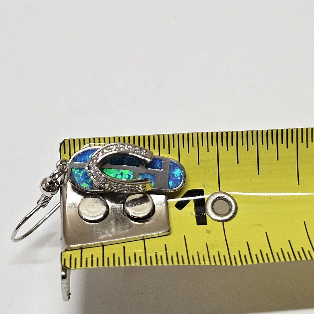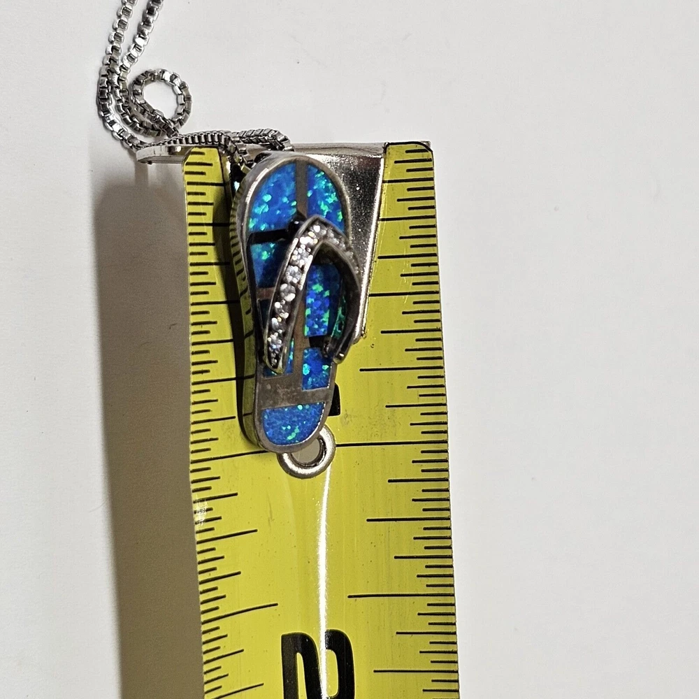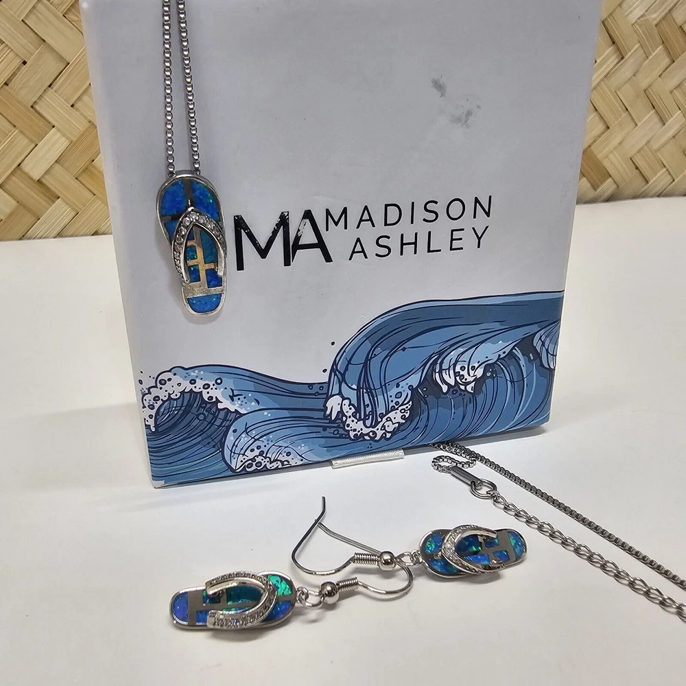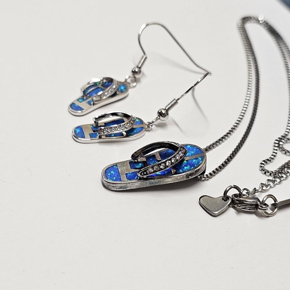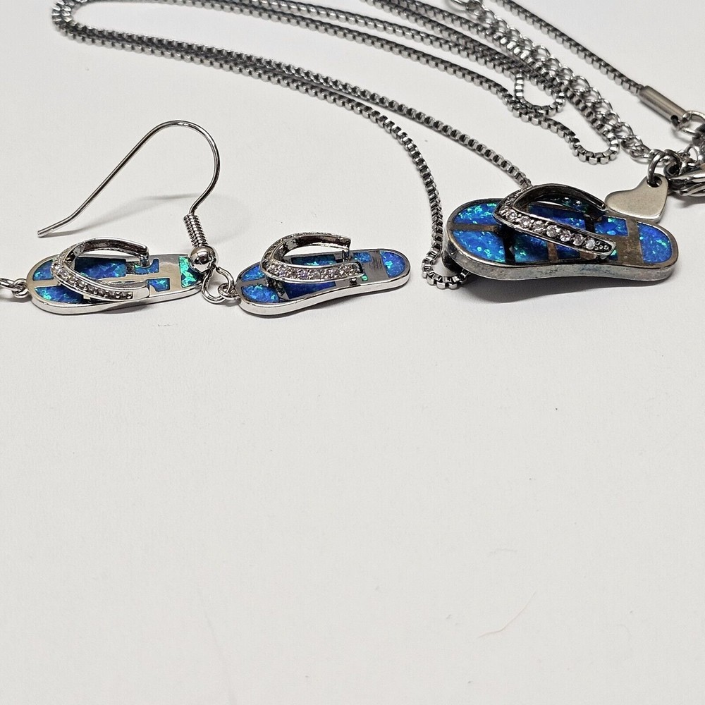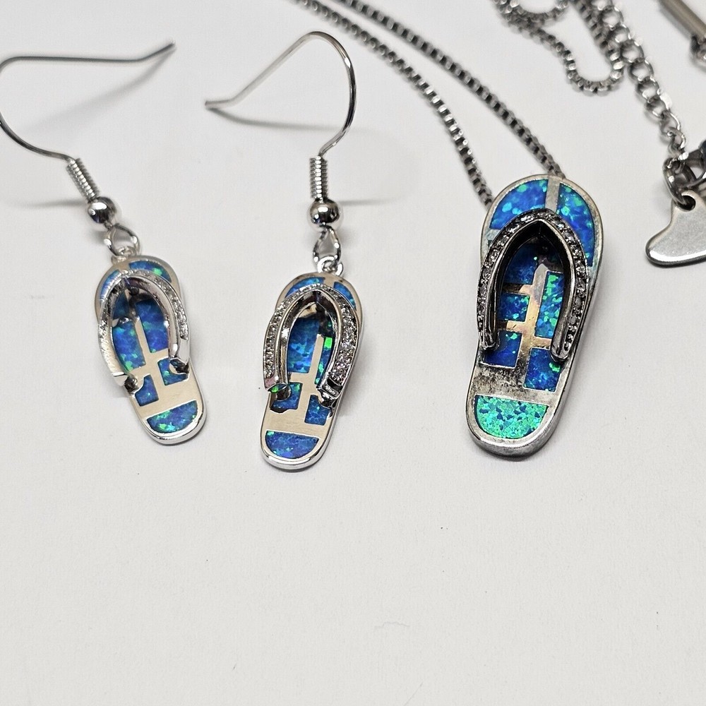 Theme: Beach, Vacation, Ocean, Tropical, Flip flop Main Stone Color: Blue Metal Purity: 925 Set Includes: Earrings, Necklace Metal: Sterling Silver Model: flip flop ocean theme Collection: Madison Ashley Color: Blue Brand: Madison Ashley Type: Jewelry Set Main Stone: Opal