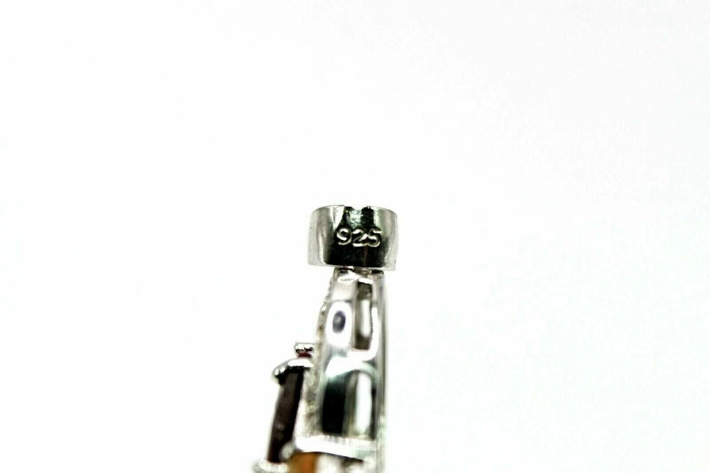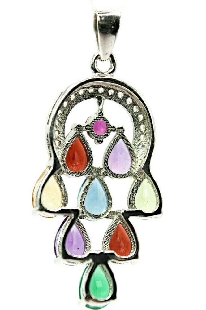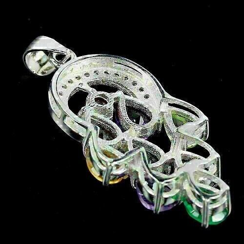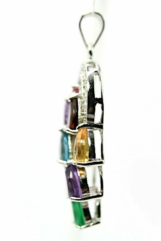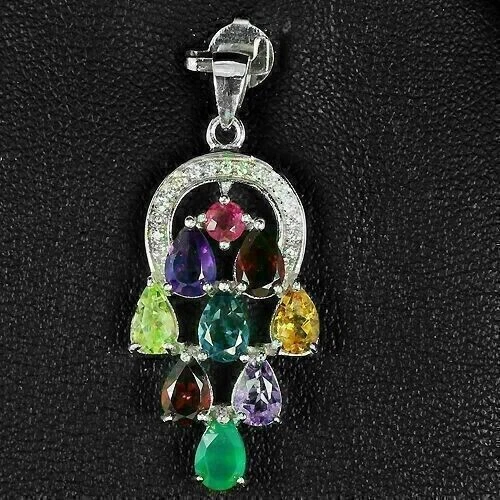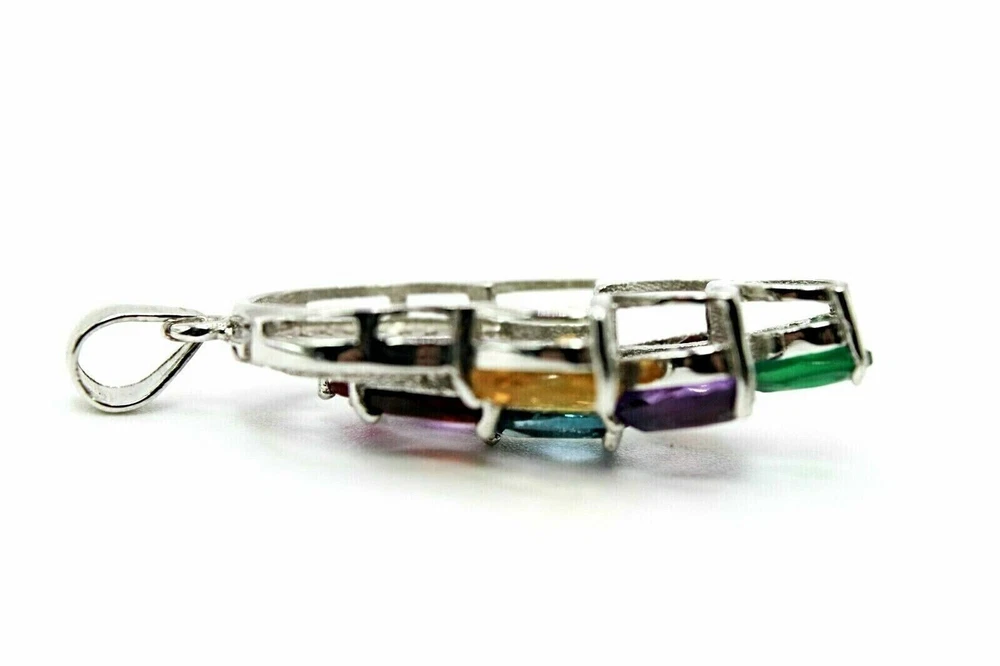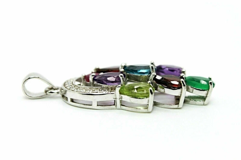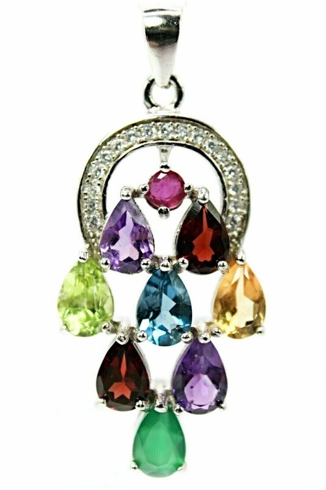 Solid sterling silver 925 stamped white gold coated pendant featuring pear cut faceted genuine natural mined gemstones each measuring 6mm x 4mm in a rainbow of colours - purple amethyst, heated london blue topaz, golden citrine, red garnet, green aventurine and green peridot with a 3mm x 3mm round cut faceted genuine natural mined heated pink ruby gemstone. The crescent at the top of the gemstones is encrusted with bright white round cut faceted 1.2mm x 1.2mm lab created zircon stones. The pendant measures 42mm x 12mm including bale and comes with a free 45.7cm 18 inch chain. GIFT BOXED Thanks for looking and please take time to view my other listings #4025/4036/4214