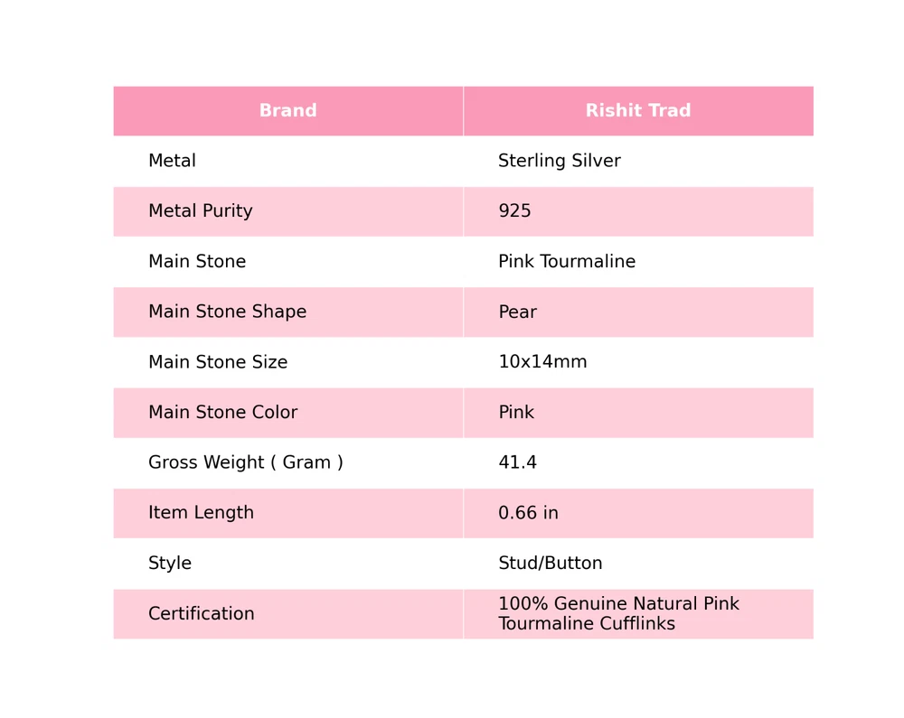 A dazzling touch of Pink Tourmaline over the 925 Sterling Silver base which adds up to the elegance of the ornament. An elegant Cufflinks of adornment that would definitely grab attention! ---------------------------------------------------- ------------ Welcome to Our Shop Rishittrad ---------------------------------------------------- ------------ Description:- SKU :- CL-6-11 Metal :- Sterling Silver Metal Purity :- 925 Gemstone :- Pink Tourmaline Gemstone Color :- Pink Gemstone Shape :- Pear Gemstone Origin :- Setting :- Channel-Set Cufflink Lenght : - 0.66 Inches ---------------------------------------------------- ------------ -------- ------------ Elegant Birthday Tribute:- Discover the essence of sophistication with our Birthday Radiance collection. Crafted with exquisite attention to detail, each piece embodies the timeless elegance and symbolic significance of birthdays. Craftsmanship Excellence:- Meticulously fashioned from premium 925 sterling silver, our jewelry pieces boast a classic and enduring design. The rich tones of natural gemstones complement the silver setting, creating a captivating harmony that resonates with wisdom and truth. Symbol of Personal Growth:- Gift with intention and meaning. Our Emblem of Wisdom pieces symbolize heartfelt wishes for personal growth and enlightenment on the recipient's special day, making it a cherished gesture of love and appreciation. Versatile Elegance:- Measuring at 1.2 inches, our creations seamlessly blend into any ensemble, offering both daily wearability and the ability to elevate sophisticated looks for special occasions. Their adaptable design ensures they become treasured additions to any jewelry collection. Thoughtful Expression of Love:- Surprise your beloved with a gift that transcends mere adornment. Our Natural Gemstone 925 Sterling Silver collection is a stylish and thoughtful token, exuding elegance and emotion while conveying warmest wishes with enduring grace. Exquisite Presentation:- Delight in the joy of gifting with our meticulously presented pieces, elegantly housed in an exquisite gift box. Make their birthday truly memorable by presenting them with a gift that captures the allure and timeless elegance of sterling silver. -------------------------- Image Policy----------------------------- All images are captured in natural lighting. The product showcased is the exact item you'll receive. -------------------------- Delivery Policy-------------------------- Standard Shipping typically takes 15-25 days, depending on your location. For expedited shipping, additional charges will apply. --------------------------- Product Policy--------------------------- You will receive the exact product depicted in the photos. All items are meticulously handcrafted. ------------------------------ Order Policy------------------------------ We welcome orders from around the globe. Custom orders are also accepted. Bulk orders are available upon request. Should you have any queries about our products, please don't hesitate to reach out. Upon receiving your product, we'd appreciate your feedback. ⋆⋆✦✧✦⋆⋆⋆⋆✦✧✦⋆⋆⋆⋆✦✧✦⋆⋆⋆⋆✦✧✦⋆⋆⋆⋆✦✧✦⋆⋆⋆⋆✦✧✦⋆⋆⋆⋆✦✧✦⋆⋆ "Discover a captivating collection of handcrafted gemstone jewelry at our boutique." https://www.ebay.com/str/rishittrad0 ♥ Thank you for choosing us ♥
