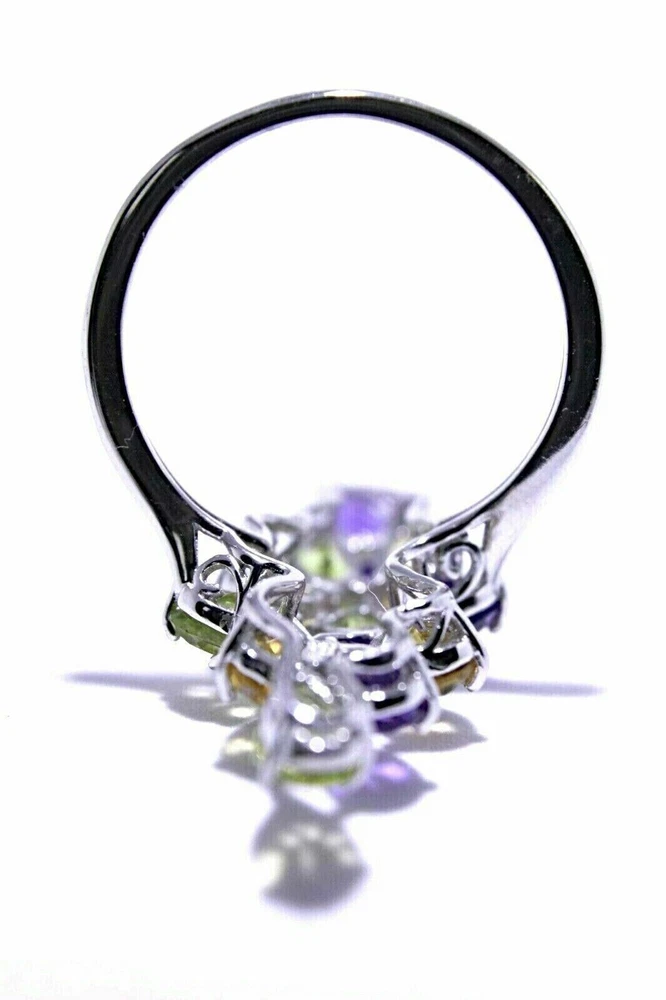 Solid sterling silver 925 stamped white gold coated ring which features pear cut faceted genuine natural mined purple amethyst, apple green peridot and golden yellow citrine gemstones each measuring 6mm x 4mm set into a large spray design ring. The face of the ring measures 33mm x 15 m m and it is a size R 1/2 (US 9). GIFT BOXED Thanks for looking and please take time to view my other listings #6794