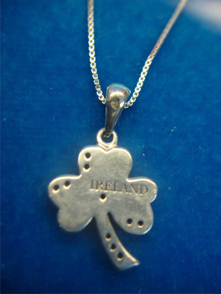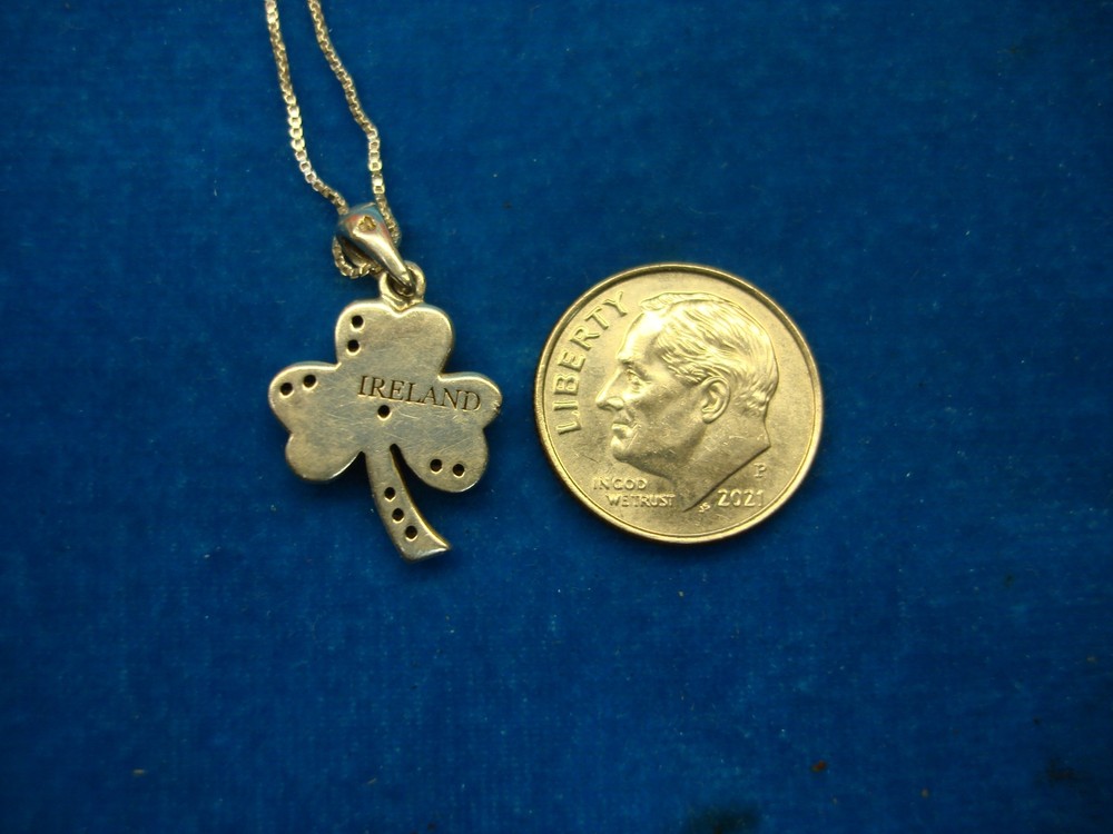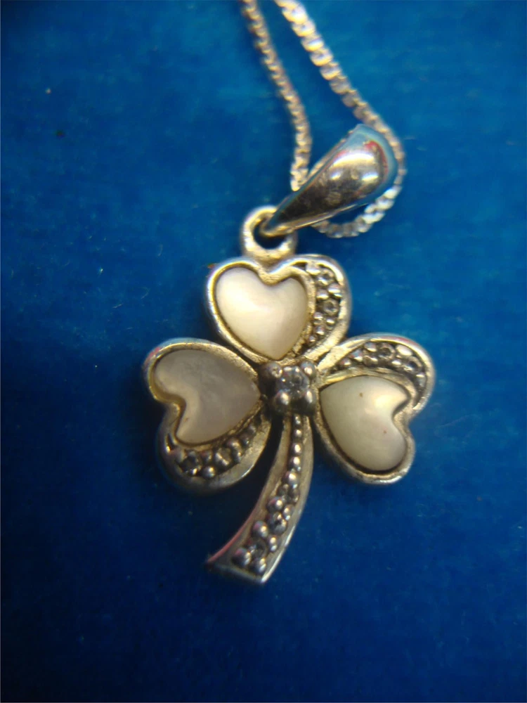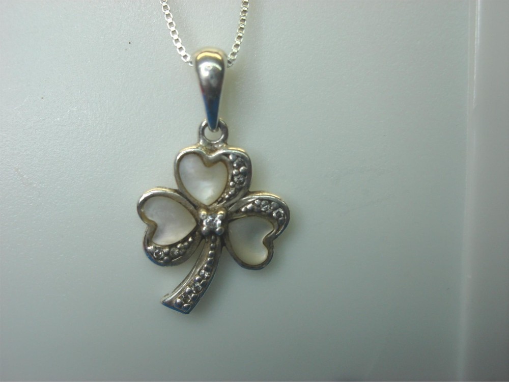 STERLING SILVER SHAMROCK PENDANT WITH MOP & 18" BOX LINK STERLING SILVER CHAIN STERLING SILVER SHAMROCK PENDANT WITH MOP & 18" BOX LINK STERLING SILVER CHAIN Description ********* HERE'S A PRETTY STERLING SILVER SHAMROCK PENDANT WITH MOTHER OF PEARL INSERTS. SHAMROCK IS MARKED "IRELAND" AND HAS OTHER MARKINGS. COMES WITH 18" STERLING SILVER .65 MM SQUARE BOX LINK CHAIN. TOTAL WEIGHT OF UNIT IS 3.2 GRAMS. PREOWNED BUT IN GREAT CONDITION. BE SURE TO TAKE A LOOK AT THE PHOTOS. PLEASE NOTE : OUR PRICES ARE FIRM. THEY ARE THE LOWEST WE CAN SELL IT FOR. WE DO NOT ACCEPT OFFERS. IF YOU OFFER..YOU WILL BE BLOCKED Terms, Payment and Shipping Information We currently only ship to the United States and through eBay's Global Shipping Program. We will help with shipping and handling charges on multi-auction wins. Shipping is usually $1.00 per auction after the first, unless there are weight or size issues. You must ask for a combined invoice when you are done buying or bidding. Most folks figure the S/H charges into their total price. A careful eBayer who takes the time to study the photos, reads the entire description, and asks pertinent questions is our best customer. The digital images we display have the most accurate color possible. However, due to differences in electronic displays, we cannot be responsible for variations in color between the actual product and your display. We reserve the right to cancel any bid. Be sure to check out our other items: Listing and template services provided by inkFrog