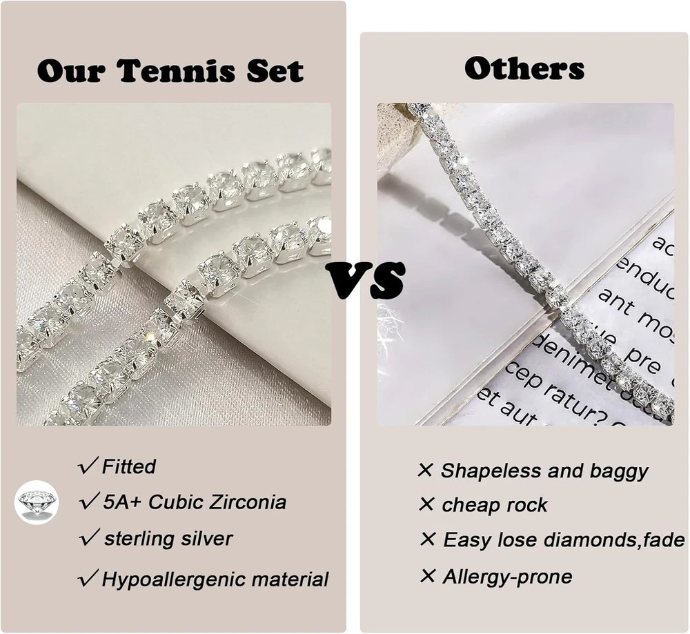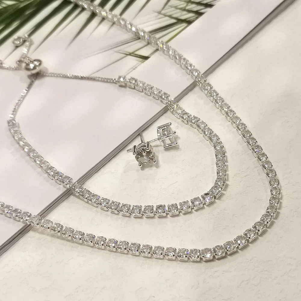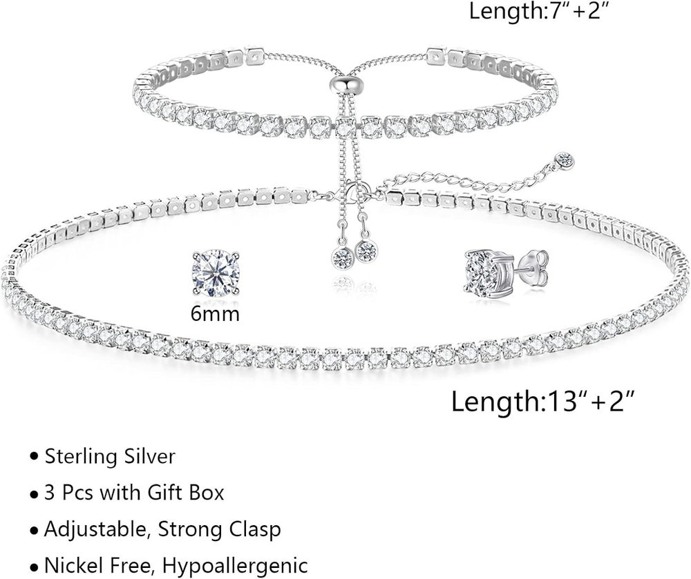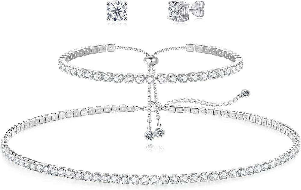 Store New Arrivals Add to Favorite View Feedback Contact Fast deliveries to the customer's home Quality customer service John Make the customers happy! Tennis Necklace Bracelet for Women, Sterling Sliver, Dainty Chocker Necklace, Crystal Bracelet for Women, Wedding Jewelry for Bride, Sparkly Party Prom Hypoallergenic Description Product Description HAXIYA Tennis Necklaces Bracelet Set A thing of beauty is a joy forever Size: Bracelet: 7"+2" / Necklace: 13"+2" Material: Sterling Silver/Cubic Zirconia. Package: Exquisite Box Color: Silver Warm Tips: In order to make it lasting as new, please keep it away from any kind of liquids like water, perfume, shower, swimming, rain etc High Quality Sterling silver and cubic zirconia, never fade or rust. 100% Nickel free! 100% lead-free, will not irritate your skin. Classic Design Beautiful and luxurious, the classic and elegant design always keep pace with fashion. Perfect Gift Come with a beautiful box, perfect for girlfriend, wife, mom or yourself. No age and sex limited. Suitable for women and men wear in any occasion. Style 3 Pcs - Necklace/Bracelet/Earrings Metal stamp 925 Sterling Silver Chain Curb Chain Gem Type No Gemstone Metal Sterling Silver Material Silver Plated Country of Origin China Ring size adjustable Department womens Package Dimensions 2.83 x 2.72 x 0.67 inches; 0.32 ounces Clasp lobster clasp ABOUT US We offer the best prices around on high quality products. Our E-store includes media such as books, movies, music and games while offering electronics, toys, sporting apparel, clothing, tools, general home, garden items and more. SHIPPING We are always working hard to ensure your package arrives as soon as possible. Please understand that some factors like weather, high postal traffic, and the performance of shipping companies are outside of our control. We offer free shipping to the lower 48 states and ship within 2 business days of payment, usually sooner. We do not accept P.O. Boxes. Please provide a physical address. For shipping outside of the continental USA, we only use eBay's Global Shipping Program. The item is shipped to KY and then sent to the rest of the world. International customers are responsible for all duties and taxes. Continue to 'check out' to calculate costs for shipping the item to your country. Messages regarding eBay's Global Shipping Program MUST be directed at eBay EXCLUSIVELY. RETURNS We offer a 30-Day Return Policy on items in which you are not completely satisfied with. You have the option of a full-refund or an exchange of the item. No returns are available on items shipped outside of the USA PAYMENT We accept PayPal. CONTACT US This page content is yet to come Please ad us to your favorite seller and visit again later Thank You CUSTOMER SATISFACTION We try our very best to make sure every customer is completely satisfied. If there's a problem, message us! We're happy to help. WE ACCEPT
