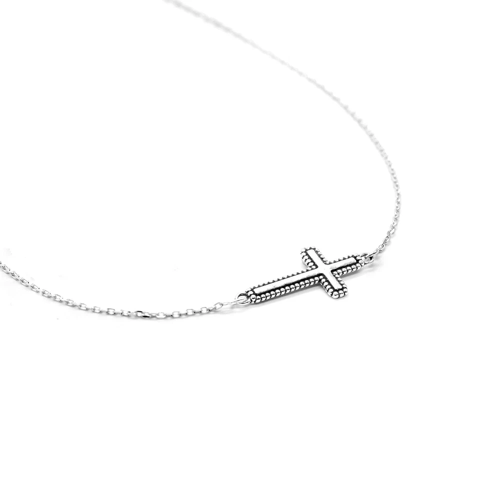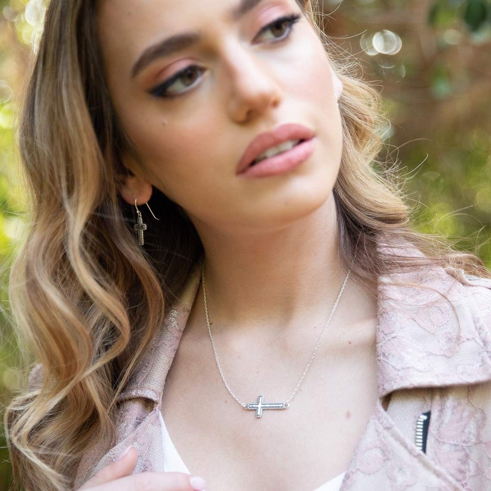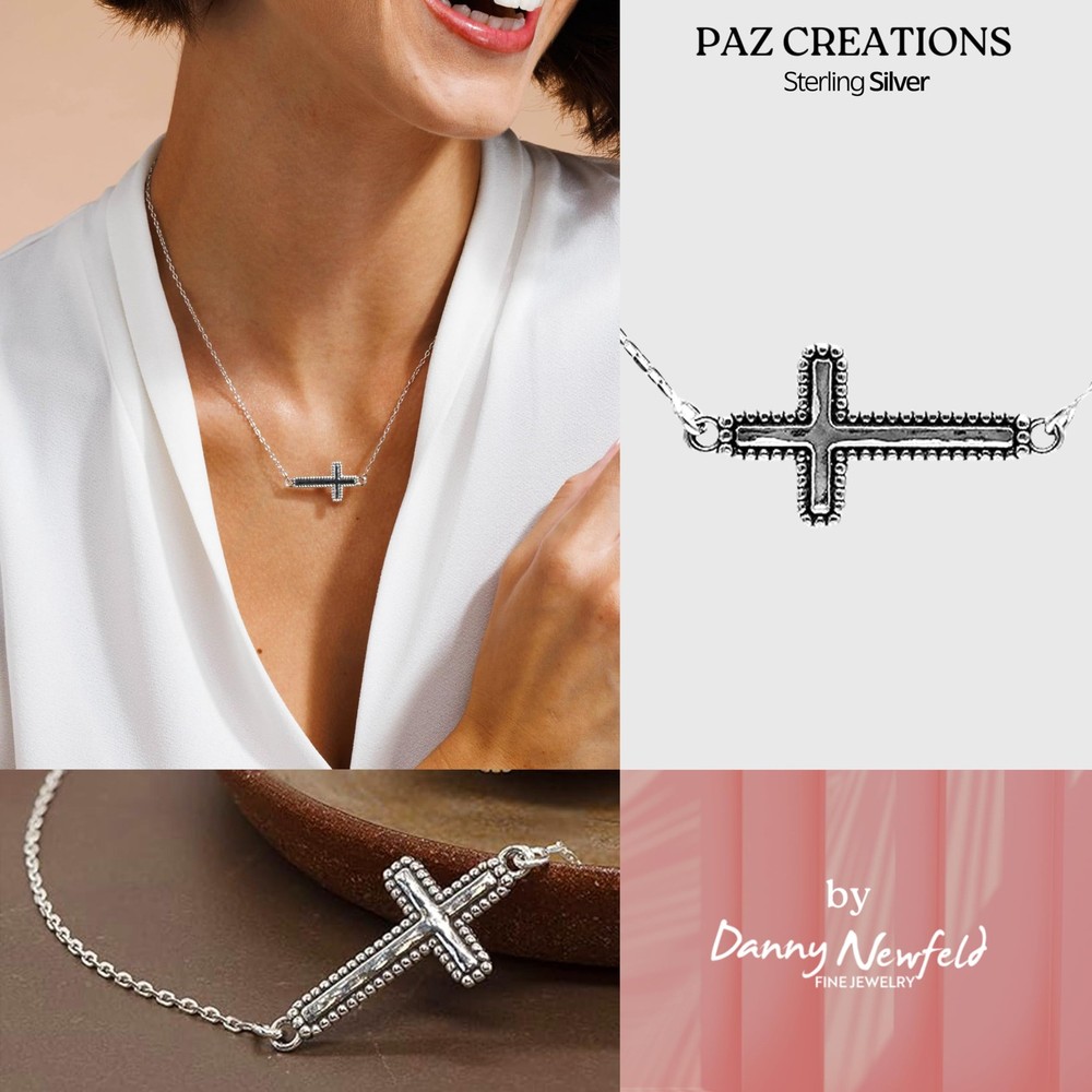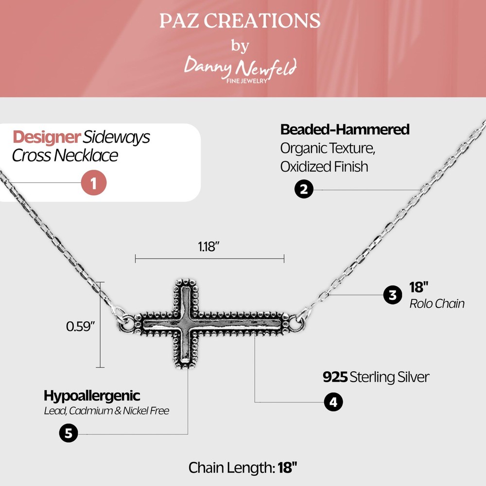 Paz Creations presents a handcrafted piece of fine jewelry made from 925 sterling silver, combining timeless elegance with meticulous Israeli craftsmanship. This beautifully designed item is hypoallergenic, durable, and perfect for any occasion—whether adding a touch of sophistication to your daily look or enhancing a special event outfit. Its intricate details and high-quality materials make it a versatile and thoughtful addition to any jewelry collection. STERLING SILVER SIDEWAYS CROSS PENDANT NECKLACE – The Sideways Cross symbolizes salvation. Jesus' work was finished, his cross was gently laid down. No longer bearing the weight of the cross, Jesus achieved salvation for his people EXQUISITE DESIGN - The hammered design with the beaded edges is highly inspired by the shapes and styles we find in the nature around us and how it is represented in many Middle Eastern and Oriental cultures - The intricate design is full of detail and pleasure to look at! COMFORTABLE FIT - Approximate measurements: 18" chain with lobster clasp PERFECT AS A GIFT - Your beautiful treasure arrives in a pretty pouch and would be a perfect gift for your wife, mother, sister, daughter, best friend or even yourself! Your jewelry box will love you! TRUE CRAFTSMANSHIP - The combination of technology and craftsmanship come together to give this necklace its unique look with a highly polished finish. A unique statement piece and a true example of fine craftsmanship from the holy land