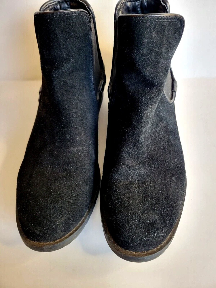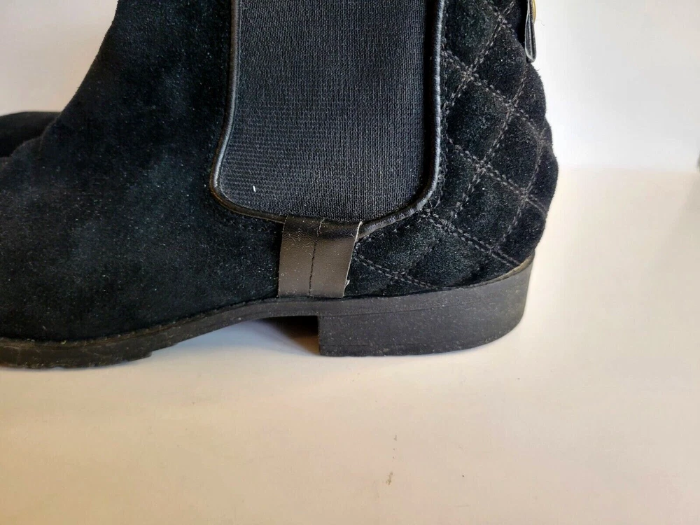Steve Madden "Gianna" black suede leather bootie. Slip on with stretchy sides and pointed toes. Pull on tabs in back with rivet accents. 1/2 inch block heal. Very nice condition with little sign of wear.