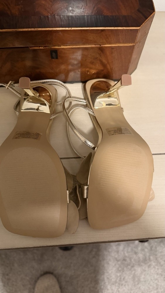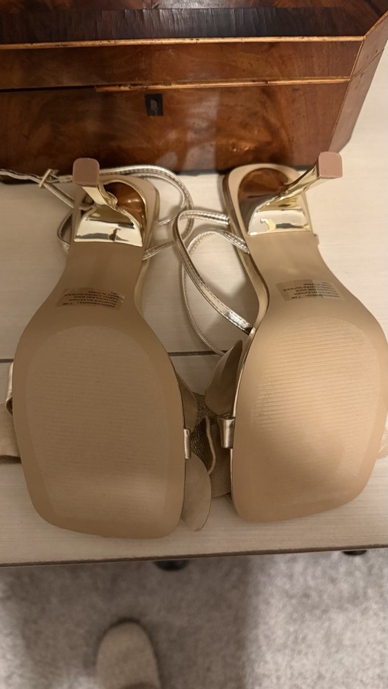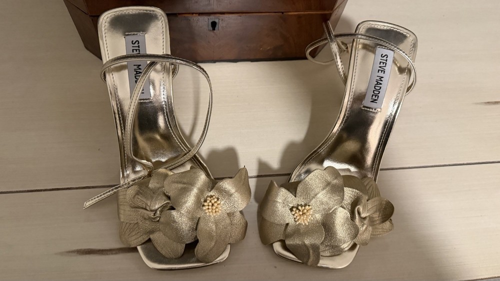 Pattern: Solid Type: Sandal Outsole Material: Fabric Coated Features: Ankle Strap Accents: Flower Closure: Buckle Brand: Steve Madden Style: Strappy Shoe Width: M MPN: AMANI/AMAN03S1 US Shoe Size: 7.5 Heel Style: Block Model: AMANI/AMAN03S1 Department: Women Occasion: Party/Cocktail, Wedding Upper Material: PU Theme: Flower, Wedding Lining Material: PU AU Shoe Size: 7.5 Insole Material: PU Color: Gold Season: Summer, Spring