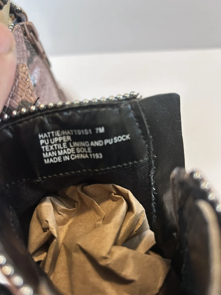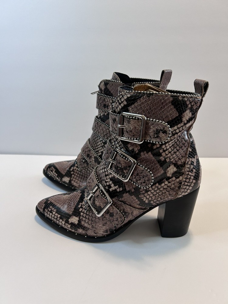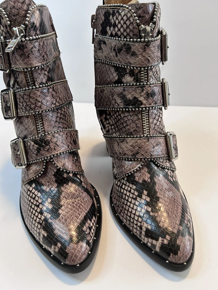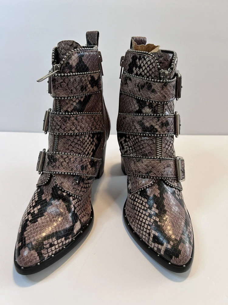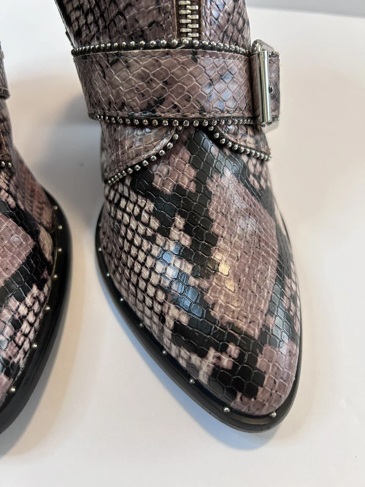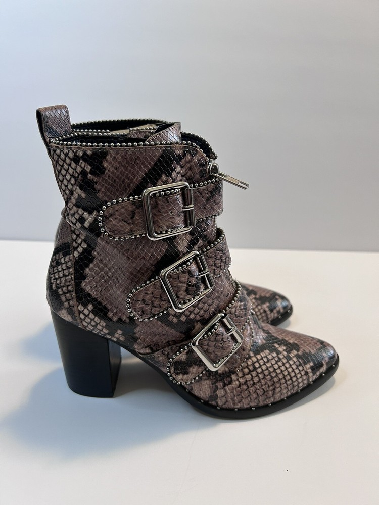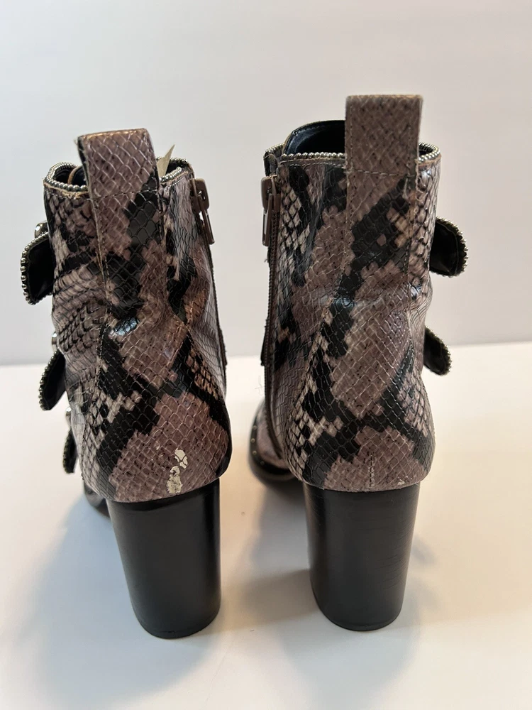 Elevate your style statement with these chic Steve Madden boots. Crafted with synthetic snakeskin upper material, these low top booties feature almond toe shape and zip closure. The multicolor animal print pattern adds a touch of wildness to your wardrobe, while the high block heel measuring 3-3.9 inches gives you the perfect lift. The studded straps and accents make these boots stand out in the crowd, making them perfect for any occasion. These women's boots are available in size 7 and are sure to be a valuable addition to your shoe collection. Size 7 Zipper closure Heel around 3” Pls check left boot has some scratches on back !!!