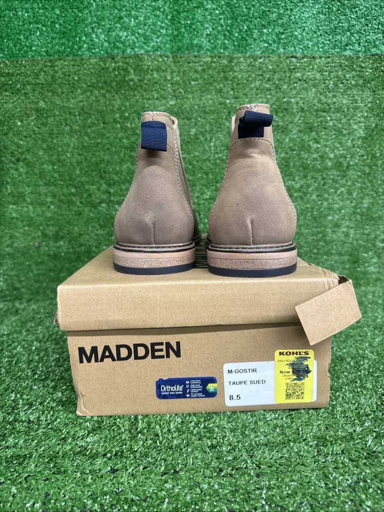 Steve Madden Men's M-grizon Taupe Sued Chelsea Boot in size 8.5 features a beige suede upper material. This Chelsea style boot from Steve Madden is designed for men and is part of the Men's Shoes category. Listed by: MDT Date:01/16/25 Condition: new in box Shade/size: 8.5 SKU:E10 Has box damage.