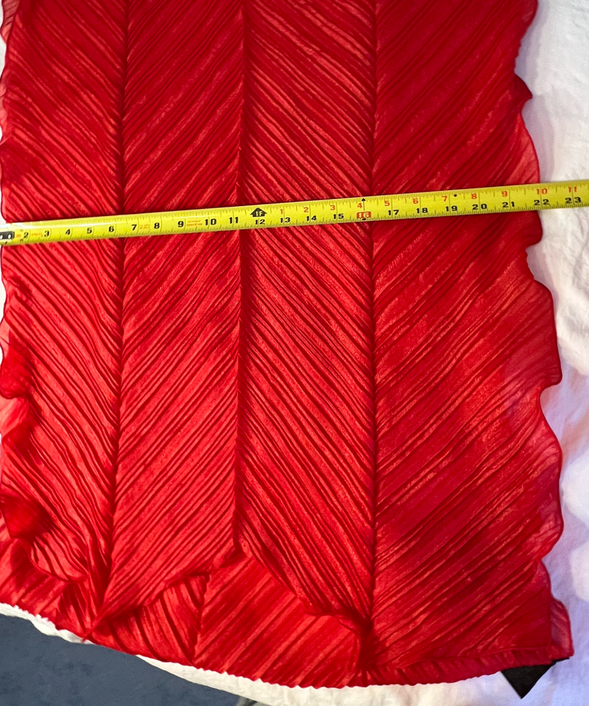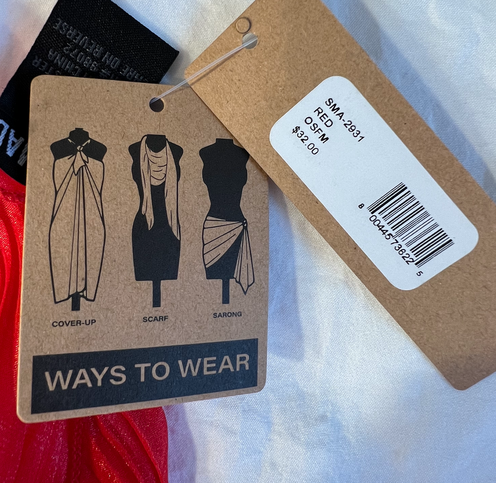 NEW WITH TAGS | $32 retail 66" length 22" width This Steve Madden scarf is a red rectangle scarf made of polyester, measuring 22 inches wide and 66 inches long. It features a scallop hem and can be worn as a scarf, cover-up, or sarong. It is versatile for different occasions and seasons. It is machine washable and suitable for women's accessories. ** all items stored in smoke-free, pet-free home
