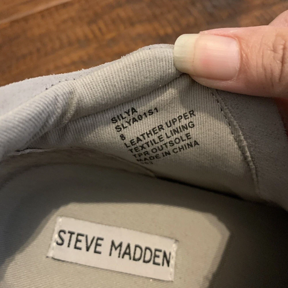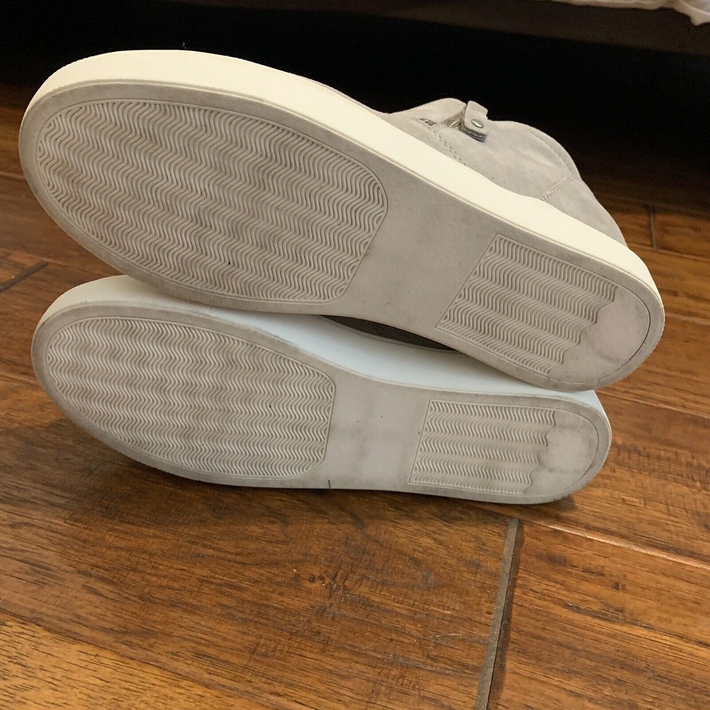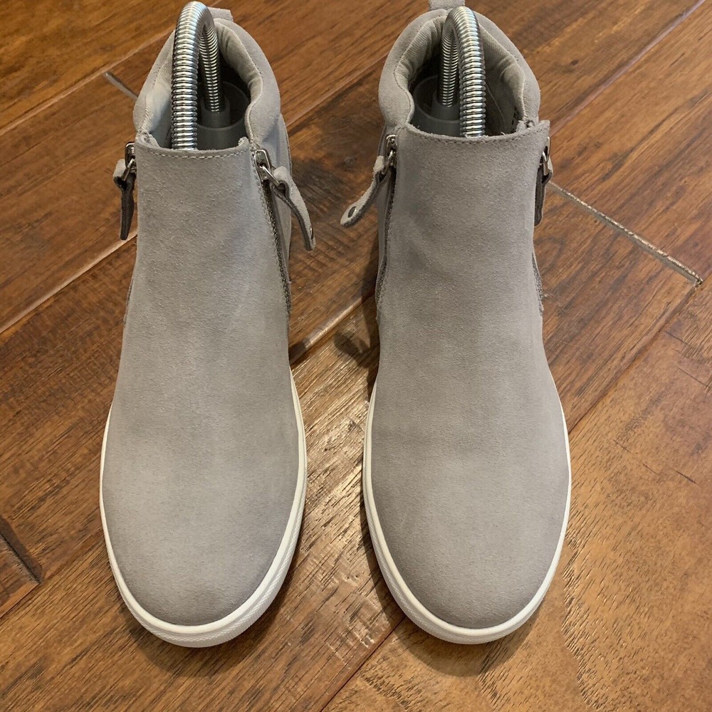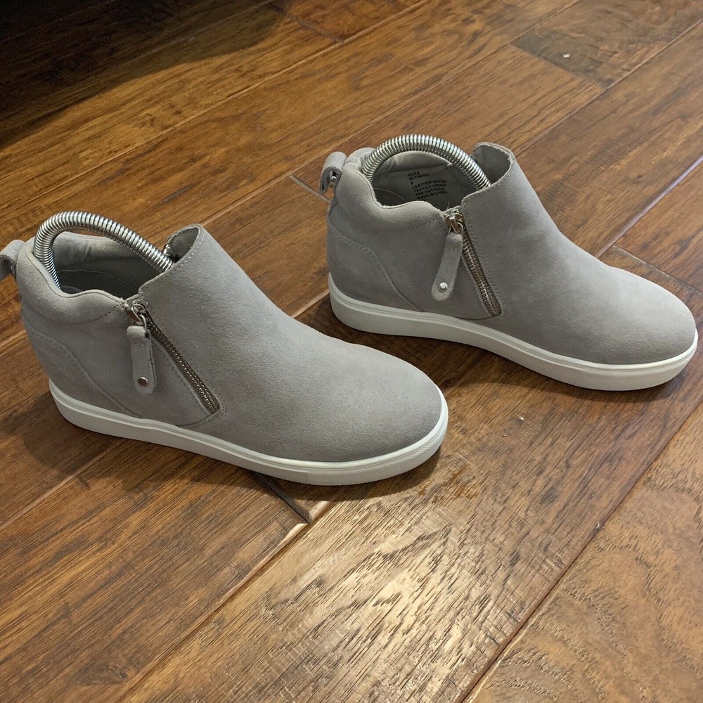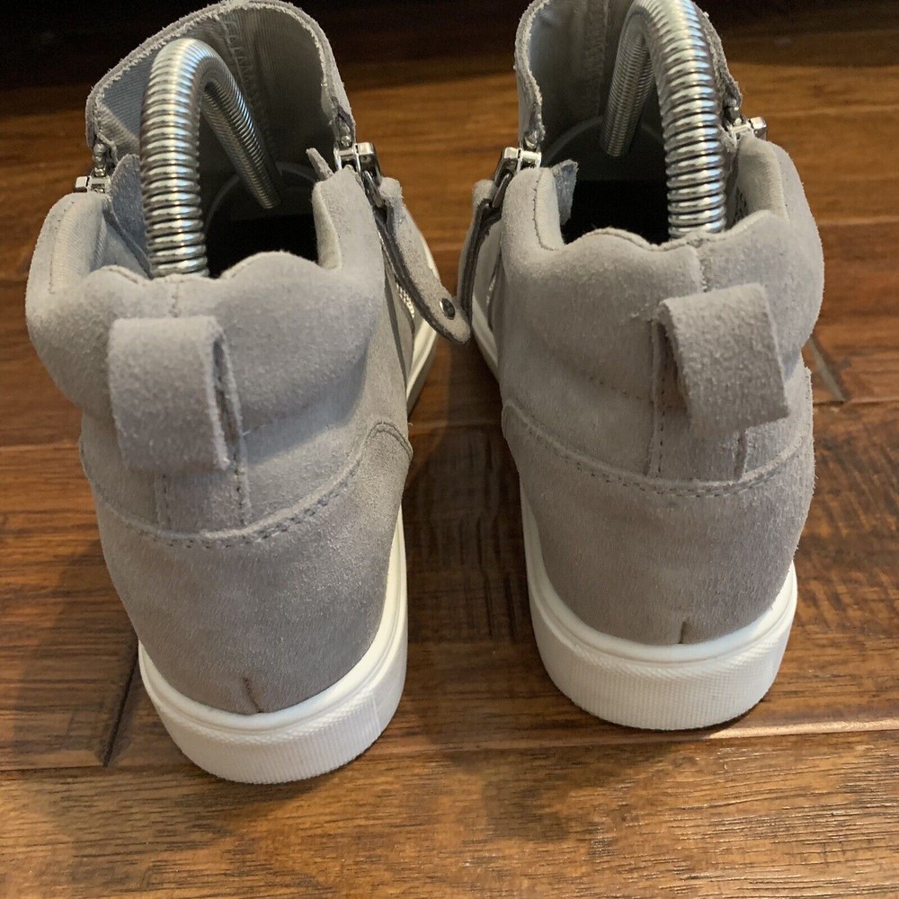 Steve Madden Silya Comfort Sneaker, Women's Size 8 Grey Hidden Wedge Ankle High. Zippers on both sides. Suede outside material. The inside slopes down similar to wearing heels. -Smoke free location