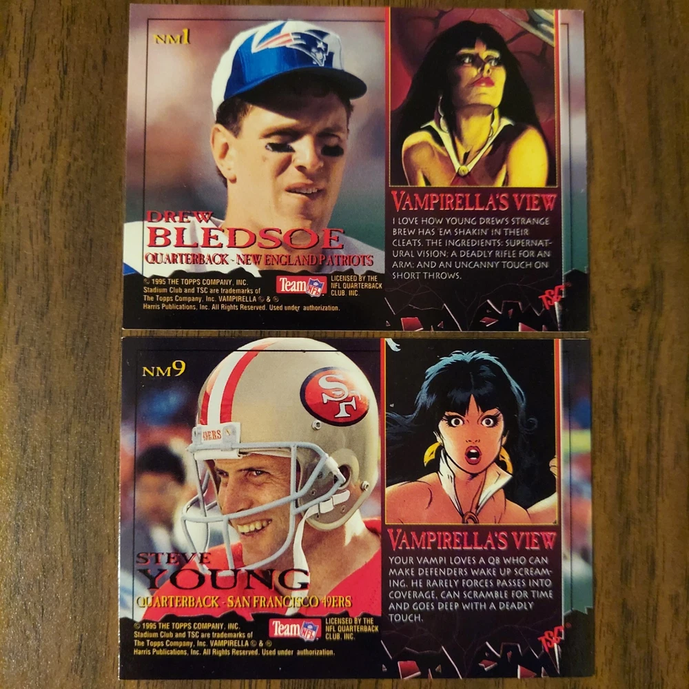 This sports trading card features Steve Young of the 49ers and Drew Bledsoe of the Patriots from the 1995 season. It is a Members Only variation from the 1995 Topps set, with an insert highlighting a Nightmare game played at that stadium. The card is perfect for collectors of football memorabilia and fans of the 49ers and the Patriots. It is a must-have for any sports trading card enthusiast, especially those who appreciate the unique features of this card.
