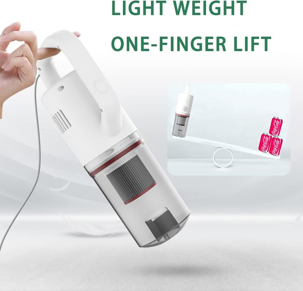 corded stick vacuum, small and lightweight Lightweight and small design stick vacuum cleaner , weighing less than 3 Ib, is extremely easy to use, and can be put into the desk drawer for storage after disassembly. It is a choice for pursuing easy housework Mini size but strong suction force has increased by 50% to 12000pa. Fine dust, pet hair, large particles such as cat litter can be easily handled , Brushless design eliminates the problem of entangled hair with a roller brush Specially designed 26ft length power cord ,can clean a room without frequent plugging and unplugging, thus reducing the trouble of frequent plugging and unplugging of corded vacuum cleaner The corded stick vacuum can be used by removing the pipe, equipping replacement crevice nozzle, converting to handy cleaner for continuous operation on all kinds of hardwood floors, short pile carpet and windowsills, sofa and bed, desk and curtain, etc 9 mini multifunctional suction heads plus 1 flat suction configuration,a variety of usage methods are waiting for your excavation. Two filter element are configured to meet the demand of consumables for 6-12 months