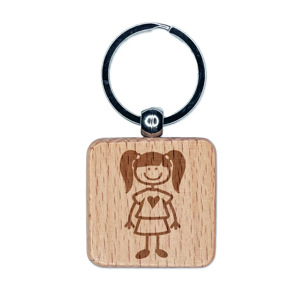 Stick Figure Girl Daughter Engraved Wood Square Keychain Tag Charm