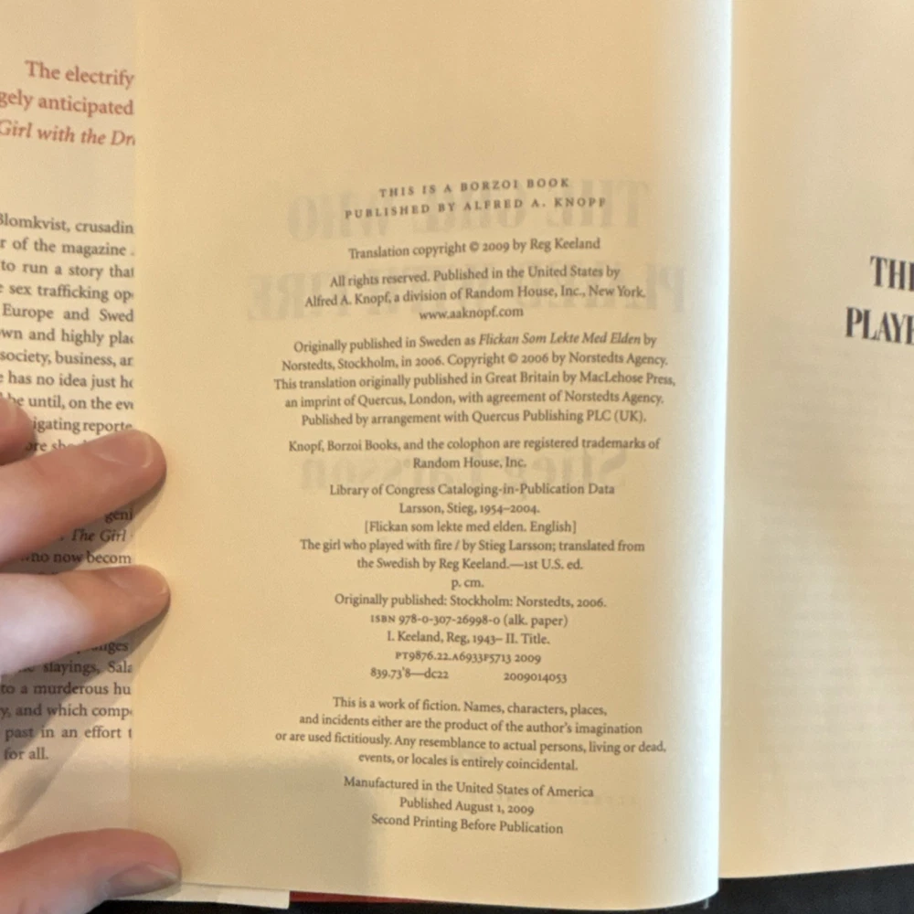 Genre:Fiction, Crime & ThrillerIntended Audience:AdultsPublication Year:2009Features:Dust JacketLanguage:EnglishFormat:HardcoverType:NovelEdition:First EditionBook Title:The Girl Who Played with FireEra:2000sAuthor:Stieg LarssonPublisher:Alfred A. KnopfOriginal Language:SwedishNarrative Type:FictionBook Series:The Girl with the Dragon TattooTopic:Crime, Thrillers / Suspense