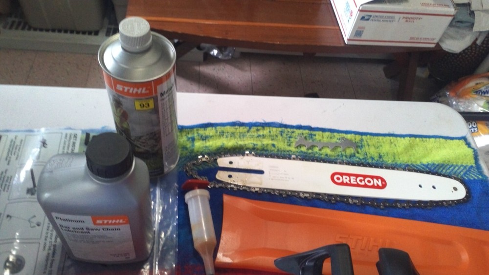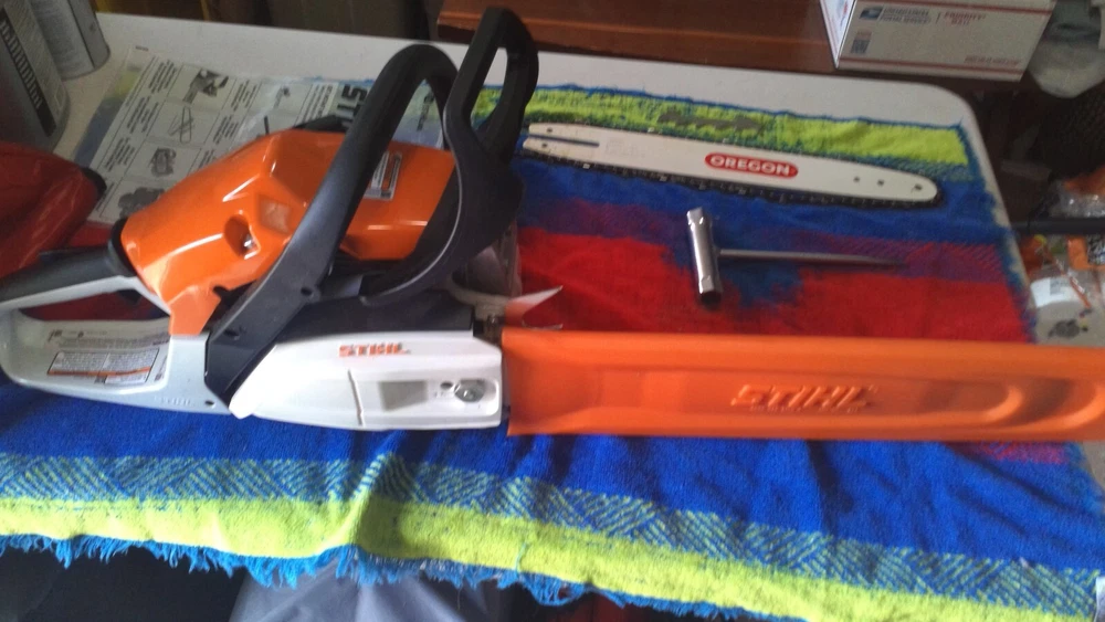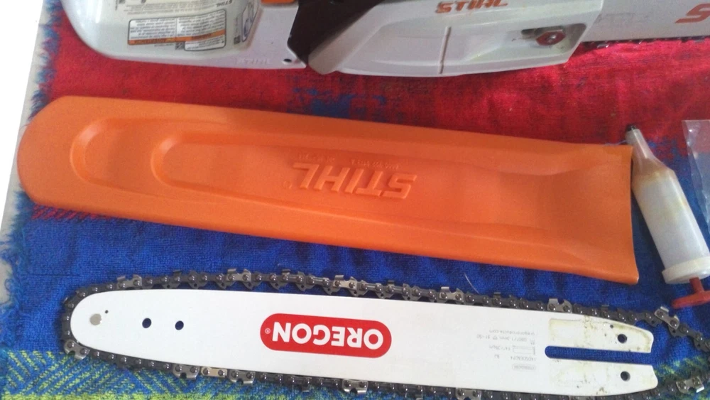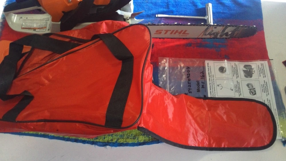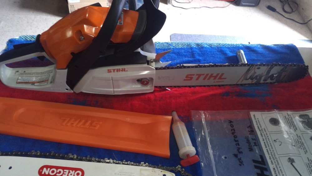 Here is an as new Stihl MS162 Chain saw.(16" ) Still under Stihl Warranty. Has been registered and any ACE Hardware will take it for a claim. Comes as bought New with instruction book, and Chain tool, Also comes with chain Lube and Premixed Fuel (all Stihl Products. The extras include a Oregon Chain and Bar.(14" heavy Duty). Comes with Stihl Chain Lube And Can of Stihl Gas mix so You can start Cutting Immediately(You don't have to Go and Buy this And that before You can Start Cutting. Also comes with a Carry Bag. Pick Up Only. PS No one can beat this deal !!!!!!! And with a warranty by Sthil. PPS Original saw bar comes with NO tip Rotator from the Factory. I supply another Bar WITH a Tip rotator And Heavier Duty Chain for Longer Cutting and More Aggressive Cutting If needed.