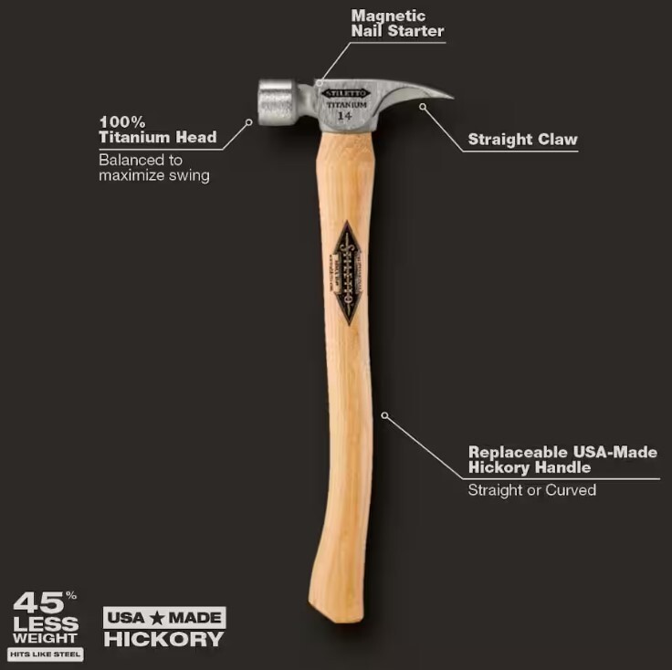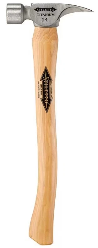 - NOTE: PLEASE READ PRODUCT DESCRIPTION CAREFULLY BEFORE PURCHASING. - NOTE: NO DELIVERY TO FREIGHT FORWARDING COMPANY ADDRESSES AND WAREHOUSE, BUSINESS ADDRESS, THE UPS STORE, UNITED STATES POSTAL SERVICE. - NOTE: WE DO NOT WORK ON SATURDAY AND SUNDAY. YOUR ORDER IS PROCESSED IN A MAXIMUM OF 10 BUSINESS DAYS, EXCLUDING SATURDAYS AND SUNDAYS. - NOTE: ORDERS TAKE A LONG TIME TO PROCESS, IF YOU CAN'T WAIT, YOU CAN SUBMIT A CANCELLATION REQUEST AT ANY TIME WHILE THE ORDER HAS NOT BEEN SHIPPED. - NOTE: DO NOT BUY MULTIPLE PRODUCTS IN THE SAME ORDER. PLEASE BUY EACH PRODUCT AS ONE ORDER. Stiletto 14 Oz. Titanium Smooth Face Hammer with 18 in. Curved Hickory Handle About This Product The Stiletto TI14SC is a 14 Oz. Titanium Smooth Face Hammer with 18 in. Curved Hickory Handle. The Hammer has a straight claw design and Stiletto's signature Magnetic Nail Starter. The TI14SC has the comparable striking force of 24 Oz. Steel hammer and is recommended for residential framing and remodeling. Stiletto Tool Company has been synonymous with high quality hand tools dating back to 1849. With its long history and strong reputation, the brand has evolved into the modern day standard for innovative, lightweight, ergonomic, productive, and professional tools. We set the standard with our line of premium titanium hand tools that span numerous trades such as framing, remodeling, finish work, siding, demolition, concrete, and drywall. Titanium is 45% lighter weight while providing the same striking force and strength as steel. Titanium tools also produce 10 times less recoil shock which helps reduce carpal tunnel syndrome. The combination of these features means less down time, more productivity, and most importantly less pain while working. Highlights 14 Oz. solid smooth face titanium head 18 in. Curved axe-style hickory handle 1.5 in. Diameter face, 17 1/2 in. overall length, 23.5 Oz. overall weight Titanium delivers ten times greater dampening of recoil than steel Lightweight and balanced titanium head reduces arm fatigue Straight claw design Stiletto's signature magnetic nail starter Dimensions Assembled Depth (in.): 18 in Assembled Height (in.): 1.5 in Assembled Width (in.): 6.25 in Handle Length (in.): 18 in Weight of Head (oz.): 14 Details Claw Type: Straight Color Family: Silver Face Type: Smooth Features: Comfort Grip Hammer Type: Straight Claw Hand Tool Type: Hammer Handle Material: Wood Head Material: Titanium Head Replaceable Head: Yes Tools Product Type: Hand Tool