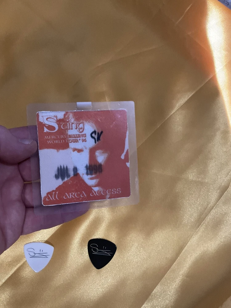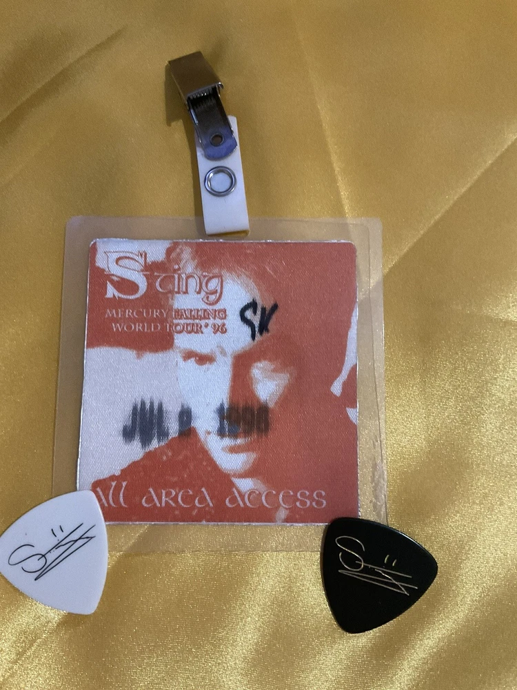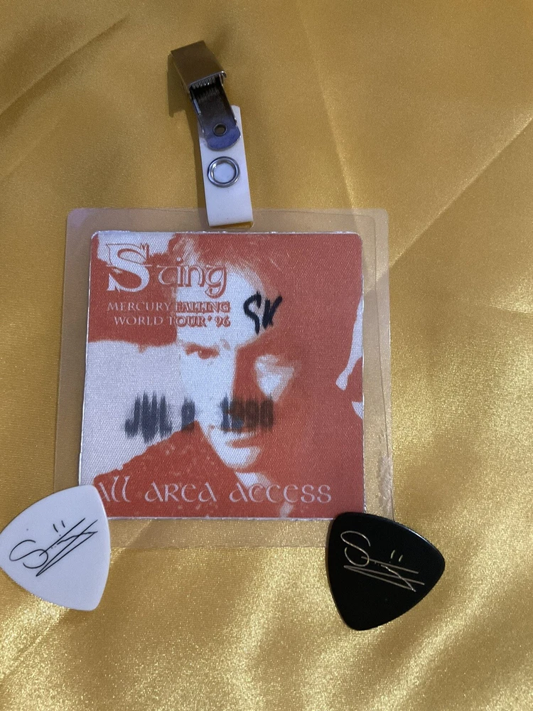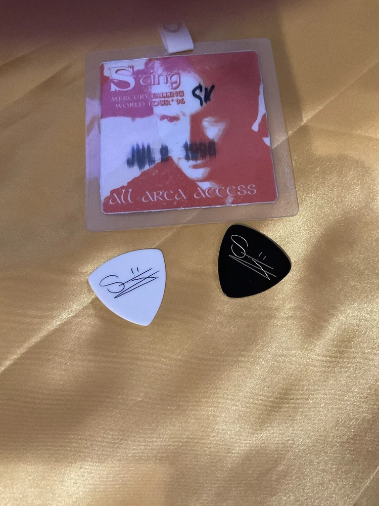 Black and White Sting Bass guitar picks from July 1996 Virginia Beach amphitheater local crew pass ,aluminum foil on back of pass was so employees could be easily seen when walking in the crowd ,actual pass is made of fabric, mass for pictures are for proof of employment and location and are not for sale in this listing.